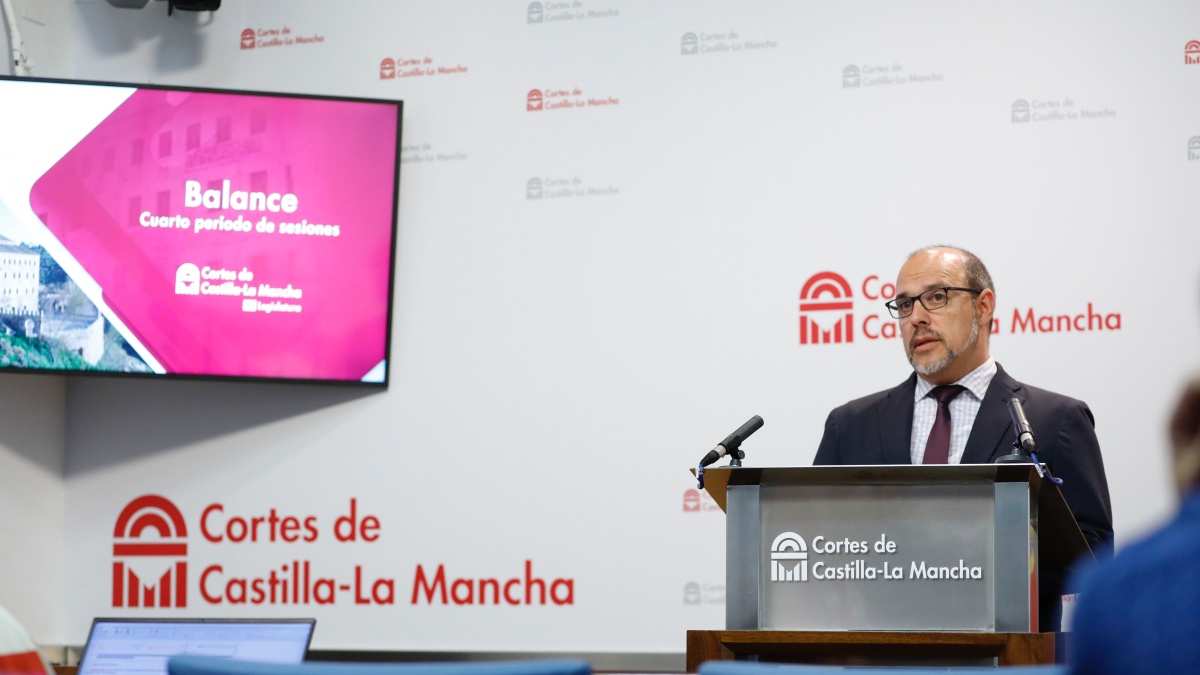 El presidente de las Cortes de Castilla-La Mancha, Pablo Bellido, ha hecho balance de actividad parlamentaria e institucional del cuarto periodo de sesiones destacando la aprobación del Estatuto de Autonomía y de otras cuatro nuevas normativas, alcanzando las 15 en el ecuador de la legislatura, “la mitad de ellas con consenso de PSOE y PP”. Una actividad que se complementa con la política de puertas abiertas a la sociedad, con cifras destacables como los más de 7.000 visitantes en el programa de Cortes Abiertas y más de 1.300 en plenos sociales y actos institucionales en esta primera mitad de la XI Legislatura.