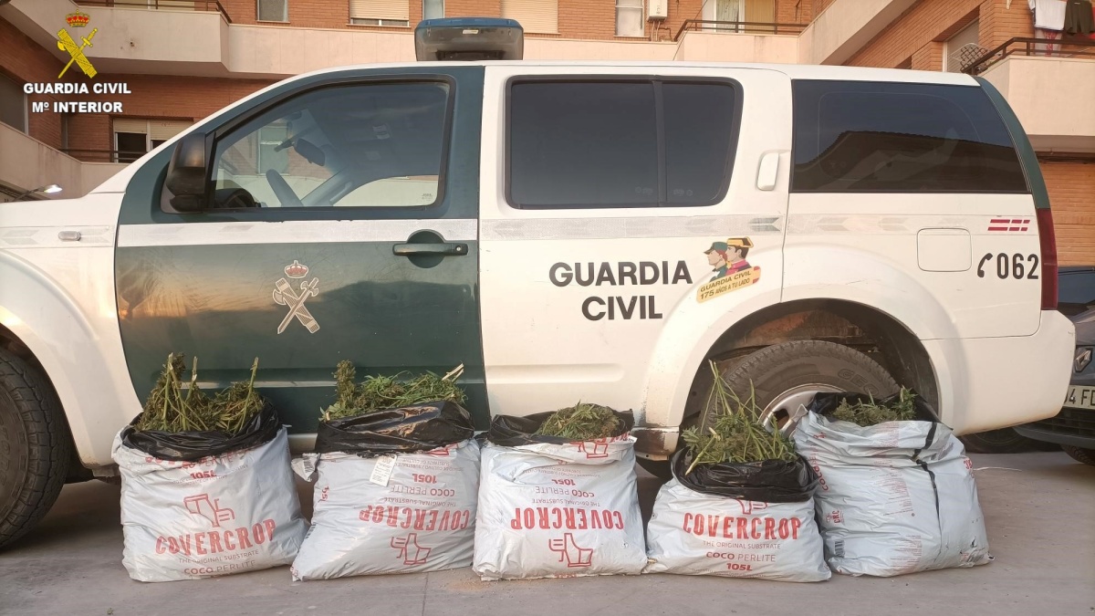 Tras un registro de los ocupantes y del vehículo, la Guardia Civil encontró un cuchillo de grandes dimensiones oculto en el pantalón de uno de ellos y dentro del maletero cinco sacos que contenían en su interior un total de 38 kilogramos de marihuana recién cortada.