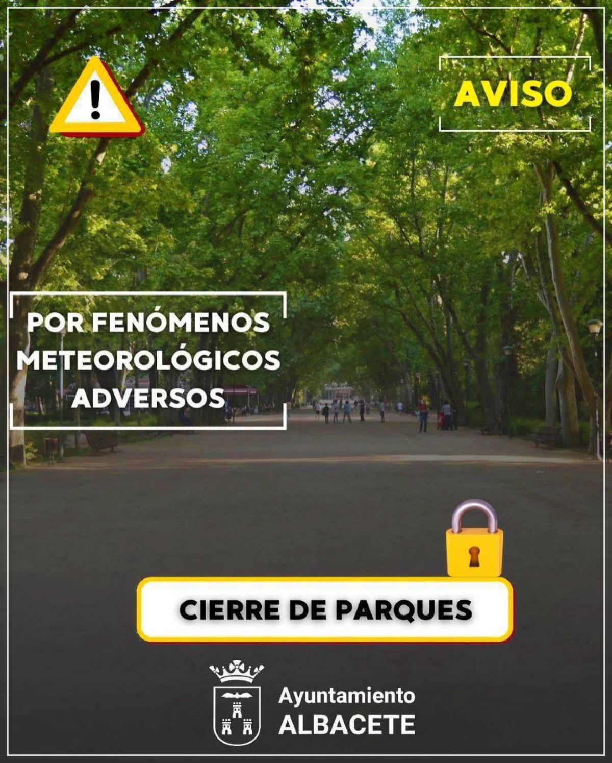 Así las cosas, el Ayuntamiento de Albacete indica que “habiendo comunicado la AEMET situación de aviso amarillo por riesgo de tormentas con probabilidad de un 40-70% en Albacete, y de granizo y fuertes rachas de viento desde las 14:00 hasta las 21:00 horas de hoy, se va a proceder al cierre de los parques»
