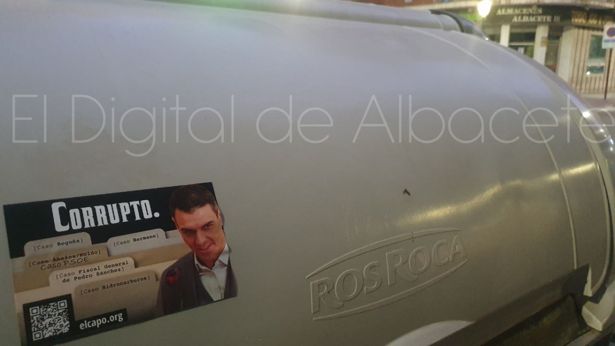 En los últimos días han aparecido unas peculiares pegatinas en algunos contenedores de basura y mobiliario urbano de la ciudad de Albacete. En concreto, es el presidente del Gobierno, Pedro Sánchez, quien protagoniza estas pegatinas que alguien habría decidido colocar en contenedores de recogida de residuos sólidos repartidos por la capital albaceteña.