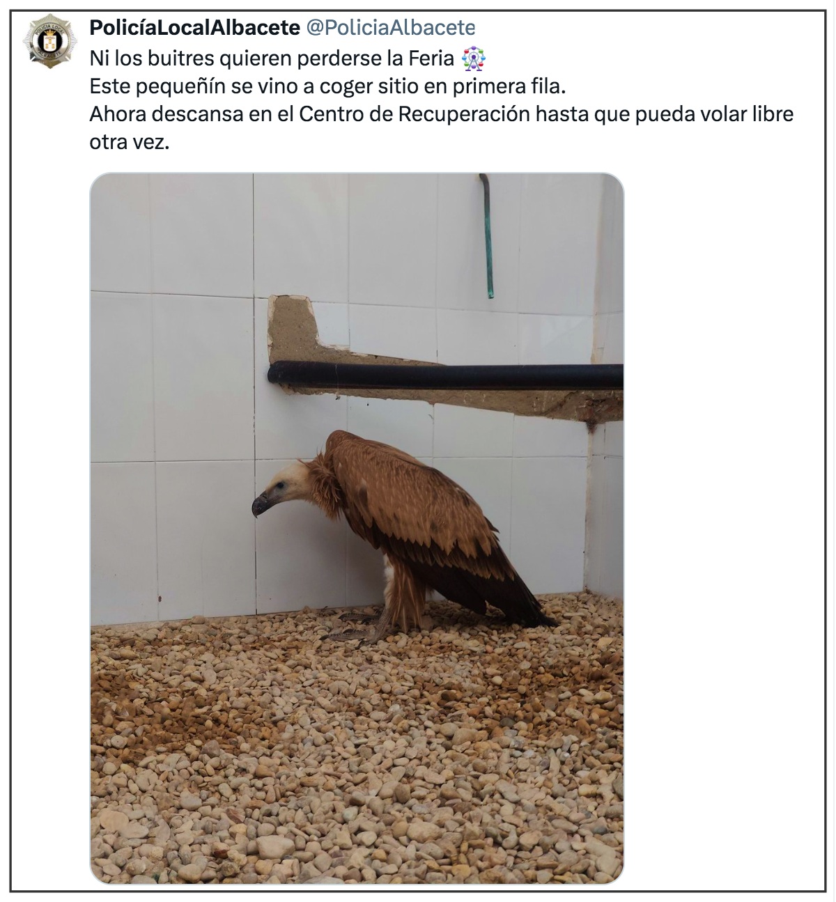 En la mañana de este martes, la Policía Local de Albacete ha rescatado al ejemplar de buitre que aparece en la imagen que acompaña esta información.