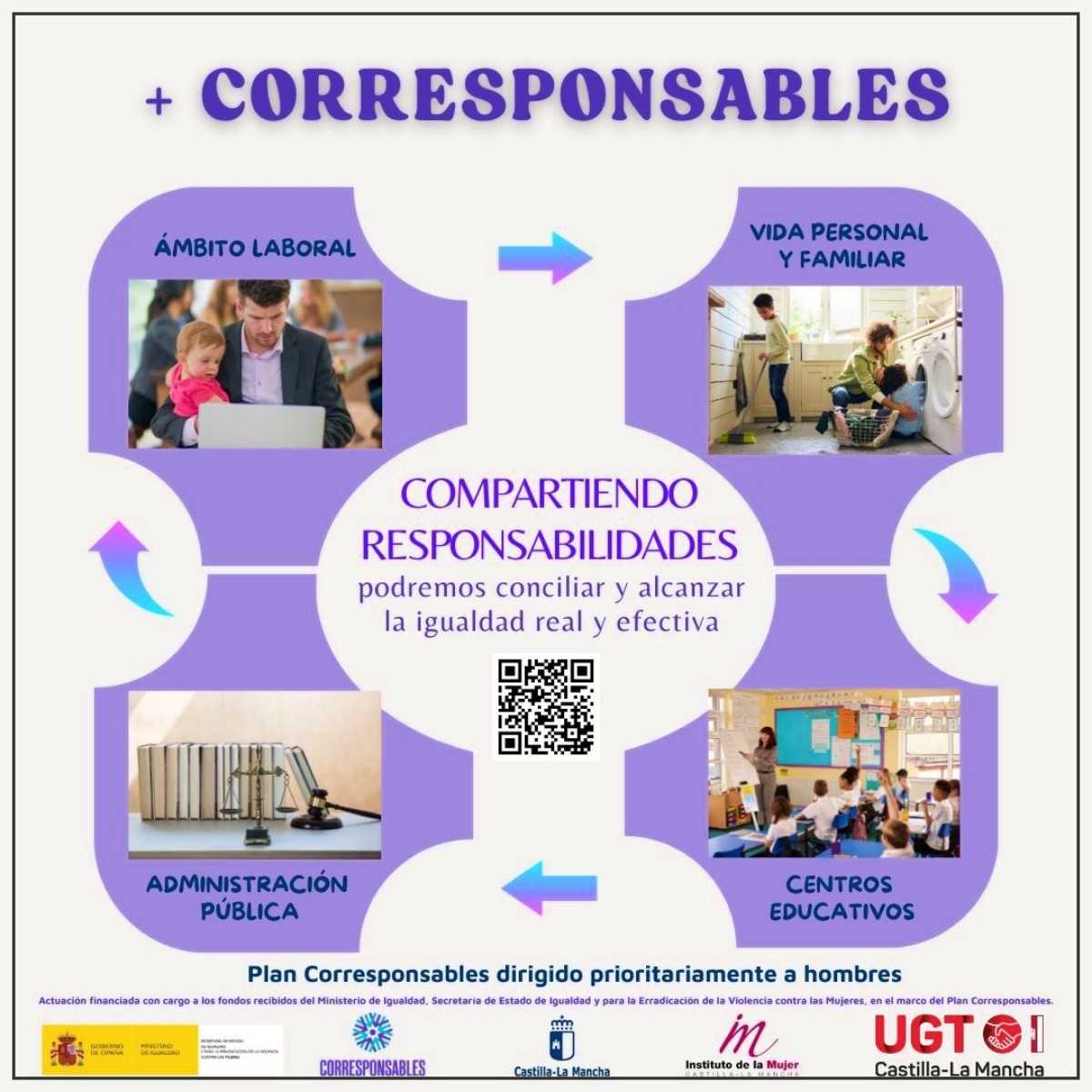 UGT Castilla-La Mancha va a comenzar sus acciones formativas sobre corresponsabilidad a través del programa “+ Corresponsables” -financiado por el Ministerio de Igualdad en el marco del Plan Corresponsables 2024 y que cuenta igualmente con la colaboración de la Junta de Comunidades y el Instituto de la Mujer de Castilla-La Mancha- cuyo objetivo es informar y formar en corresponsabilidad.