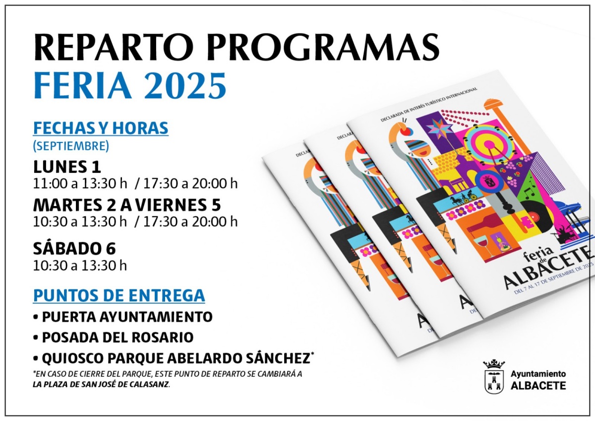 Así las cosas, el alcalde de Albacete, Manuel Serrano, iniciará el tradicional reparto del programa oficial de la Feria de Albacete 2025 el próximo lunes, 1 de septiembre, a partir de las 11:00 horas en los soportales del Ayuntamiento, acompañado por miembros de la Corporación Municipal.