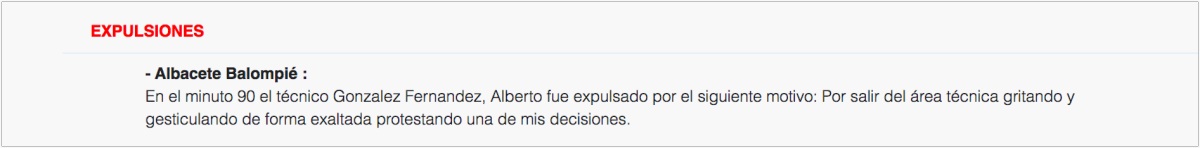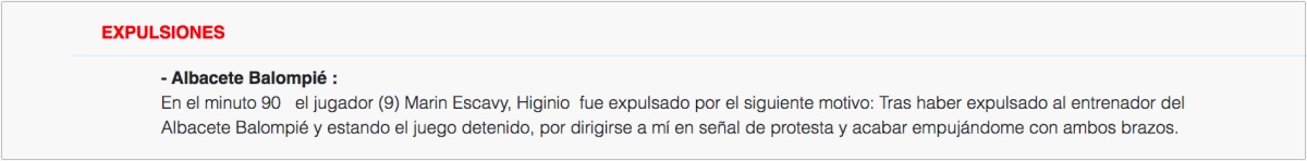 Completada la redacción del acta por el árbitro, el colegiado expone los siguientes motivos como causas de ambas expulsiones: