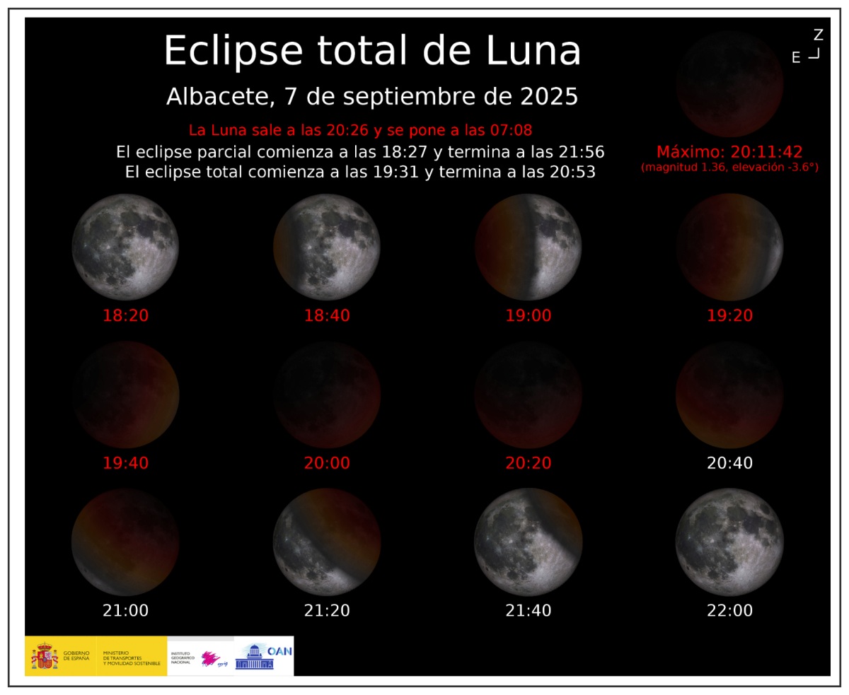 Según muestra la siguiente infografía del Observatorio Astronómico Nacional, las fases del eclipse lunar para Albacete capital serán las siguientes: