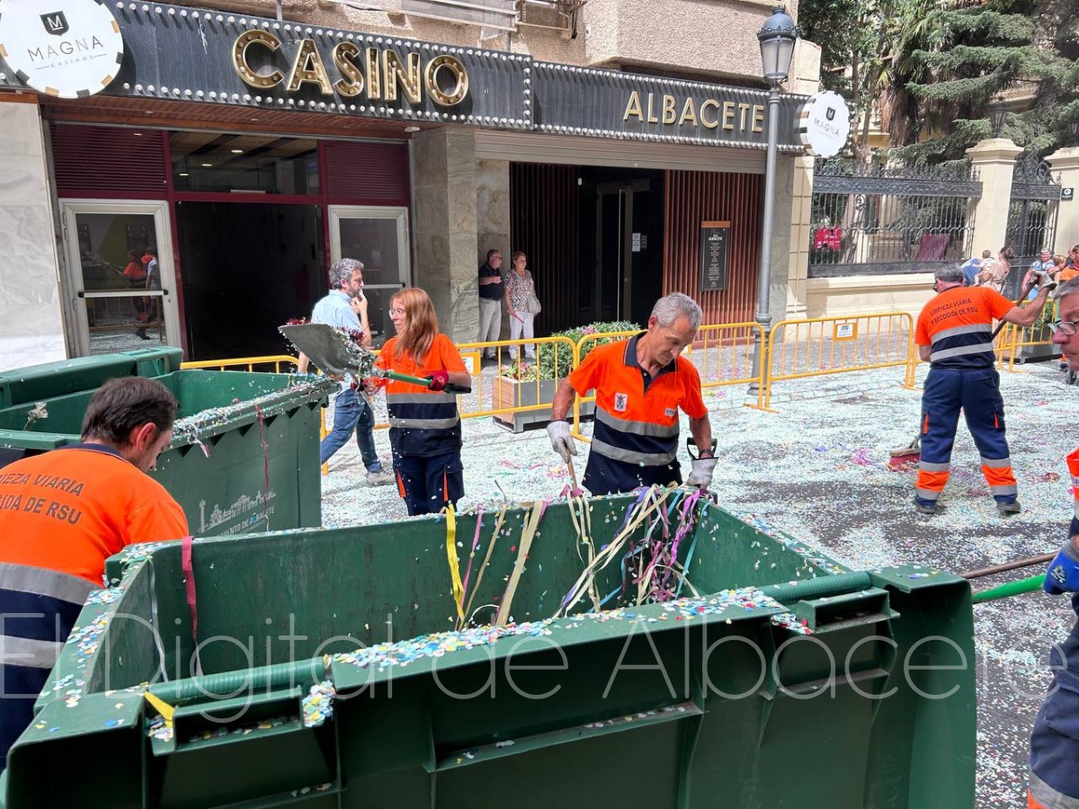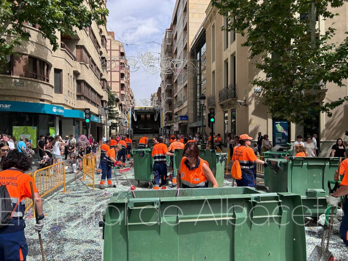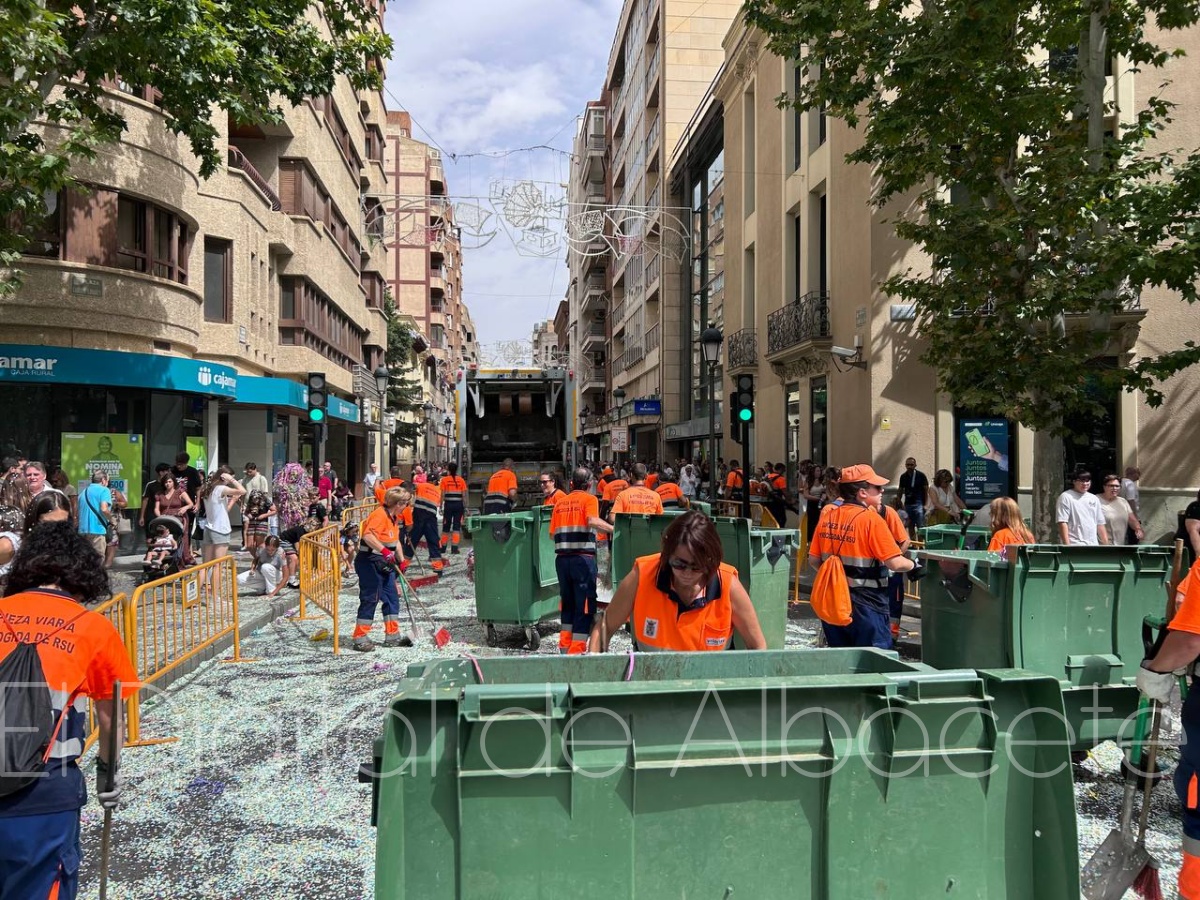 Sin embargo, detrás de esta explosión de color, hay un gran trabajo que muchas veces pasa desapercibido. Nada más terminar la Batalla de Flores, los operarios de la empresa Valoriza, encargada del servicio de limpieza viaria y recogida de residuos de Albacete, se han puesto manos a la obra para devolver a las calles su aspecto habitual.