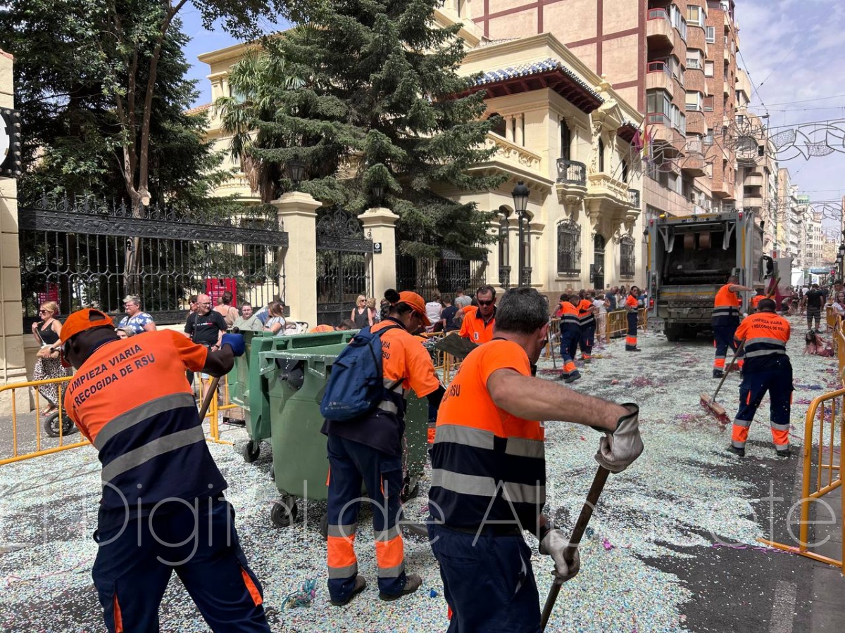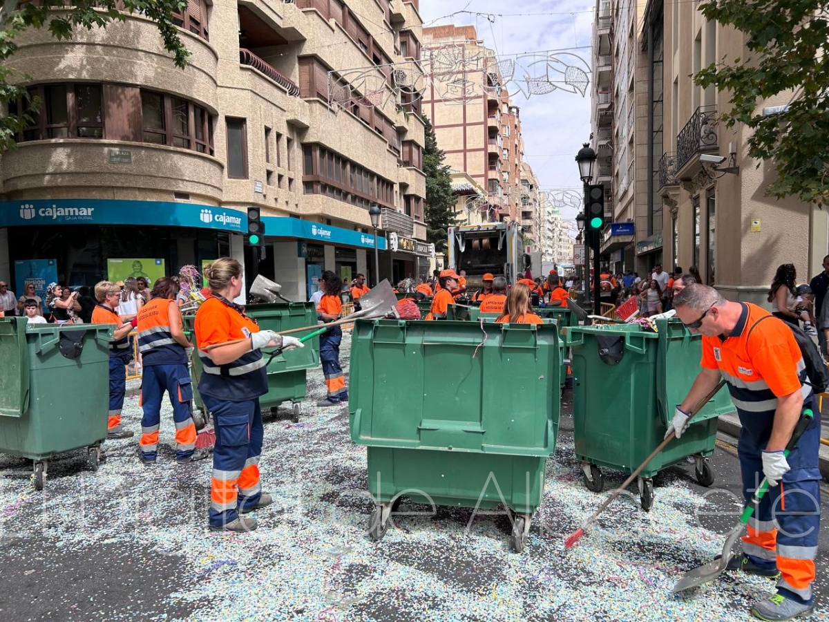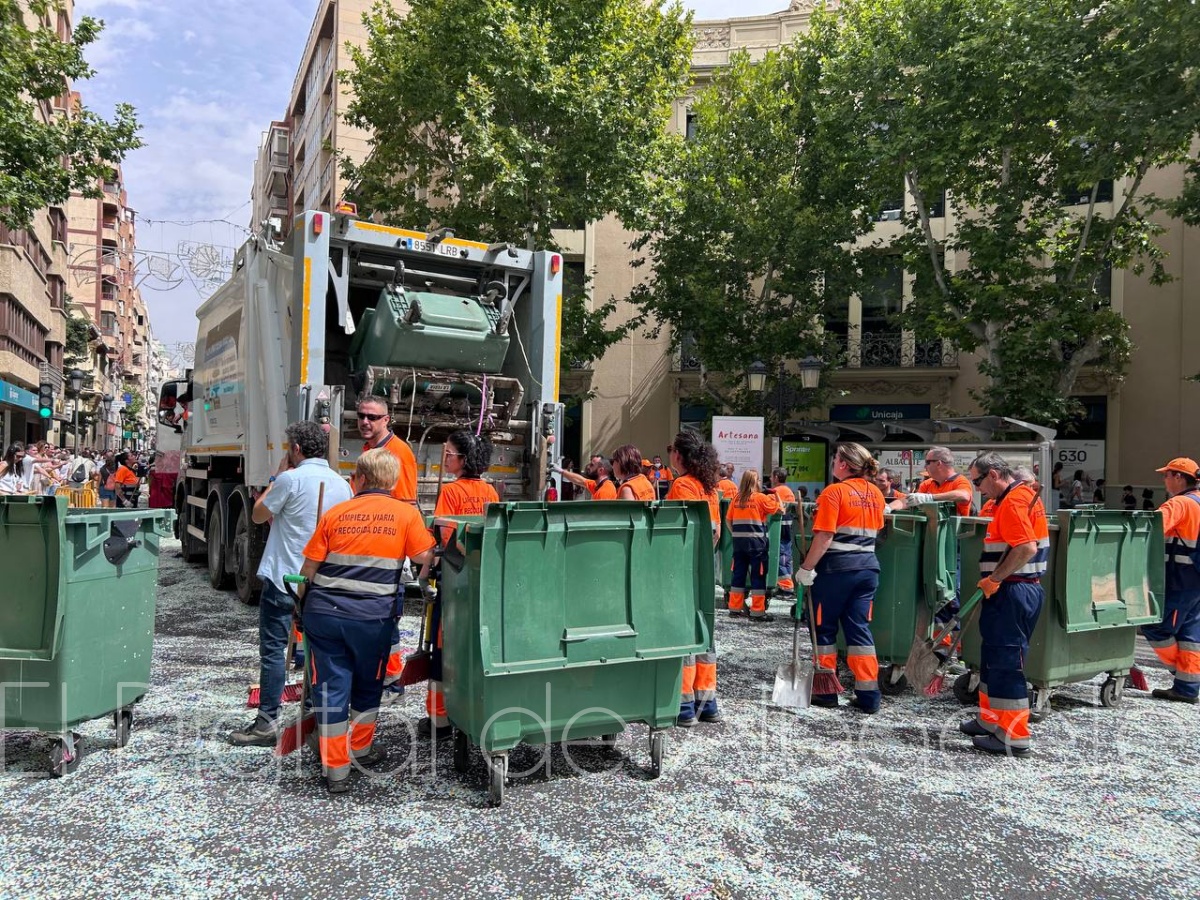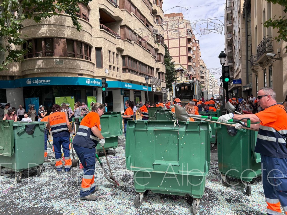 Sin embargo, detrás de esta explosión de color, hay un gran trabajo que muchas veces pasa desapercibido. Nada más terminar la Batalla de Flores, los operarios de la empresa Valoriza, encargada del servicio de limpieza viaria y recogida de residuos de Albacete, se han puesto manos a la obra para devolver a las calles su aspecto habitual.