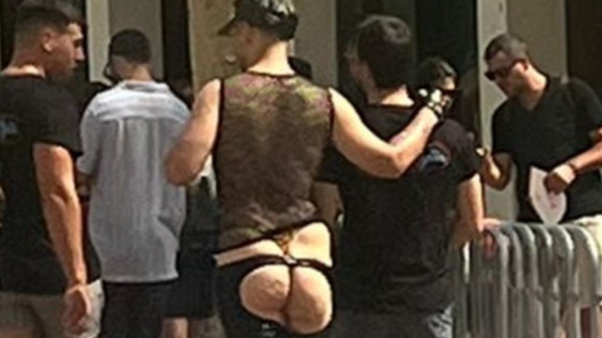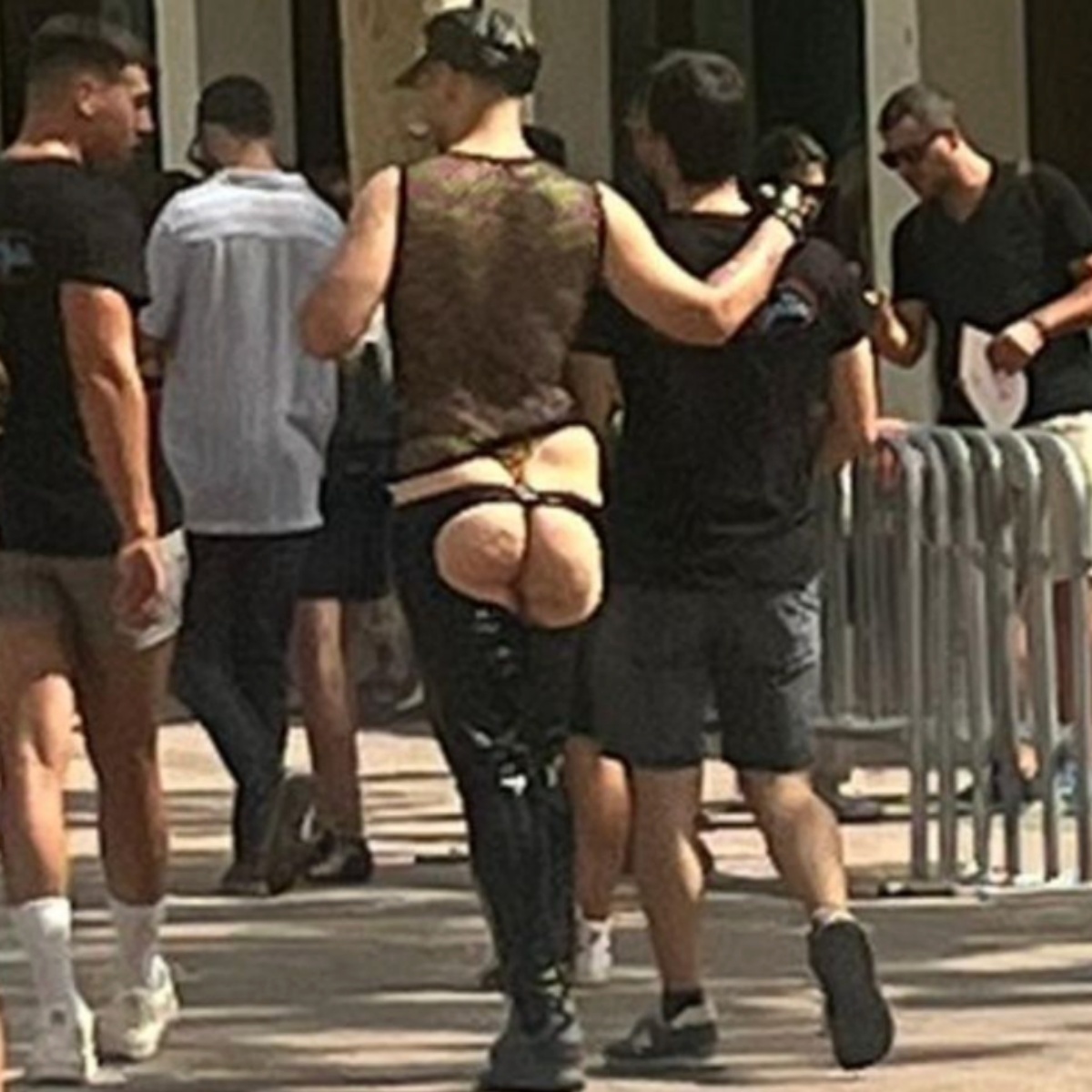 Un joven fue visto paseando entre la multitud con un ‘outfit’ cuanto menos llamativo: pantalón de cuero con aberturas traseras que dejaban al descubierto gran parte de su culo, únicamente cubierto por un tanga. Completaba el conjunto con una camiseta de transparencias sin mangas y una gorra estilo militar.