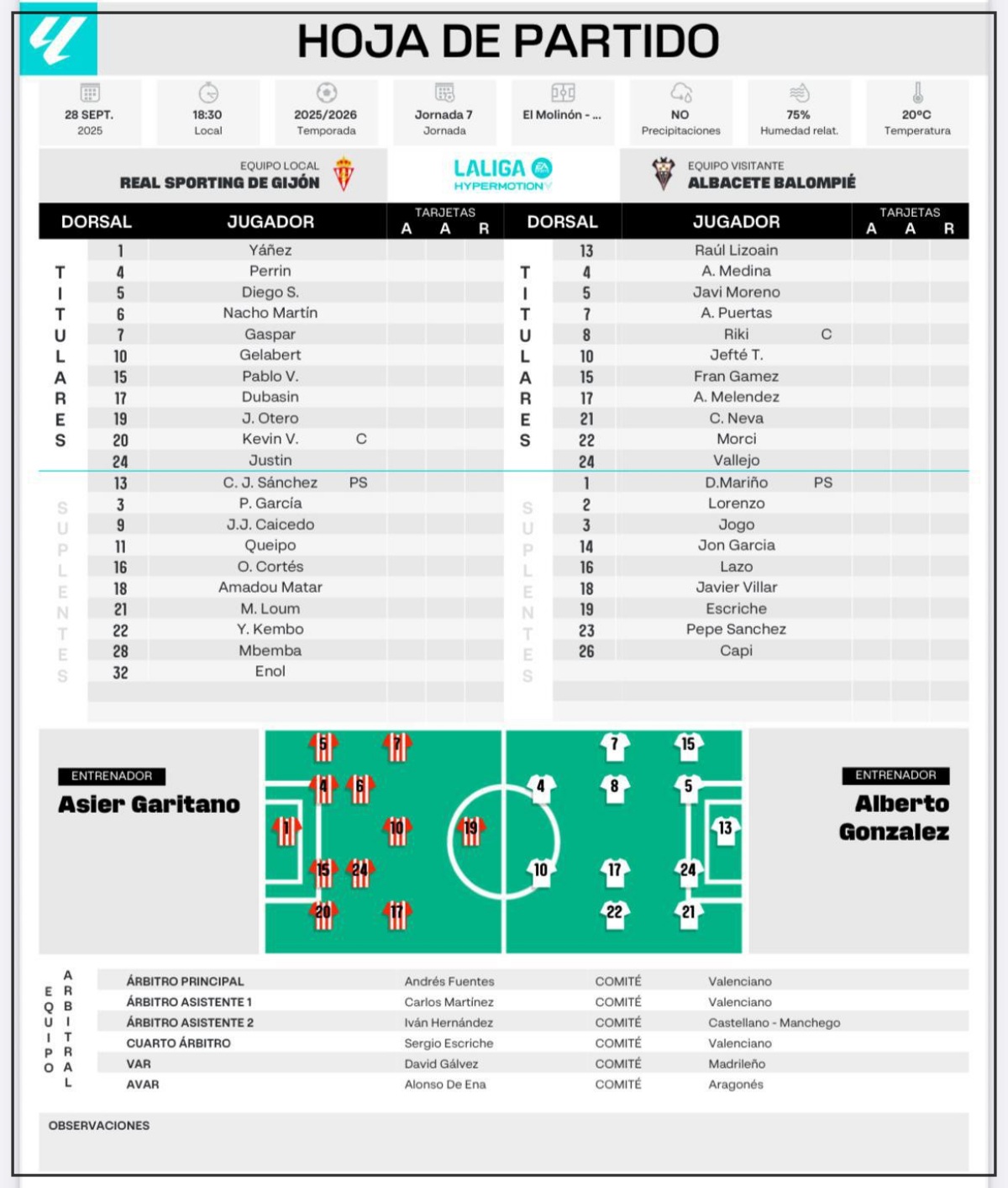 Diego Mariño (PS), Pepe Sánchez, Jon García, Lorenzo Aguado, José Carlos Lazo, Javi Villar, Jonathan Goméz, Dani Escriche y el canterano Hugo Martín ‘Capi’, completaron la lista de convocados y comenzaron el partido en el banquillo junto a Alberto González esperando su oportunidad desde la suplencia. Higinio, por sanción, y Víctor Valverde y Antonio Pachecho, por lesión, se quedaron en Albacete y no viajaron a tierras asturianas.