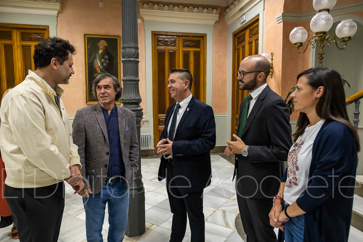 Ha llegado acompañado de Ioana Nicolaie, también reconocida escritora y esposa de Cărtărescu; parte del equipo del Oh’Poetry Festival (como uno de sus directores, el escritor Andrés García Cerdán; y la periodista, poetisa y máster en escritura creativa, Almudena Sánchez). Ya en el edificio provincial, el presidente Cabañero ha tenido ocasión de presentarle al vicepresidente, Fran Valera, a la diputada Raquel Ruiz y al diputado José Antonio Gómez, así como al grueso del Servicio de Educación y Cultura de la ‘casa’ provincial, con Mª Luisa Fajardo al frente, teniendo ocasión de compartir una foto de grupo.