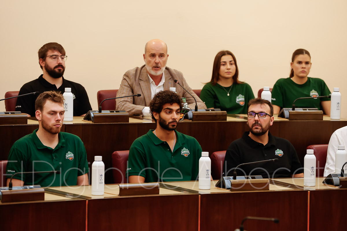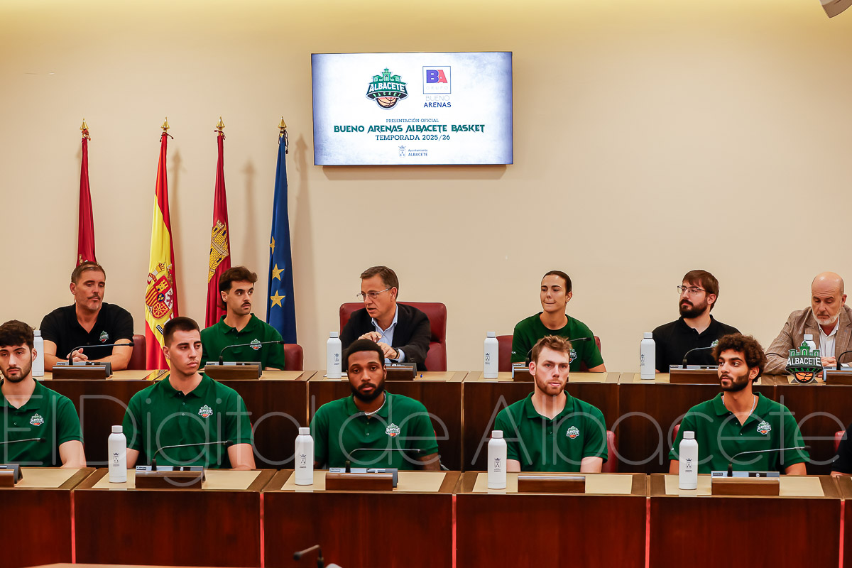 Estas palabras las pronunció Serrano durante la presentación oficial del Bueno Arenas Albacete Basket para la temporada 2025/2026, un acto celebrado en el salón de Plenos municipal. Allí estuvo acompañado por el presidente de la entidad, Rafael Ortega, el técnico del equipo, David Varela, el concejal de Deportes, Francisco Villaescusa, además de otros representantes de la Corporación.