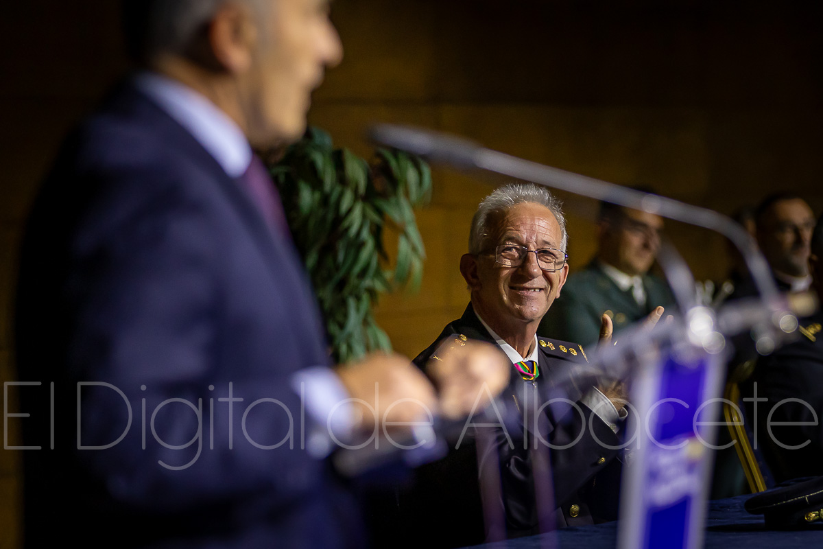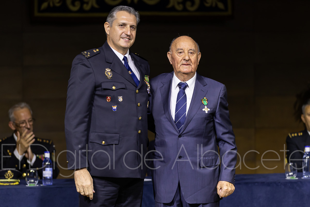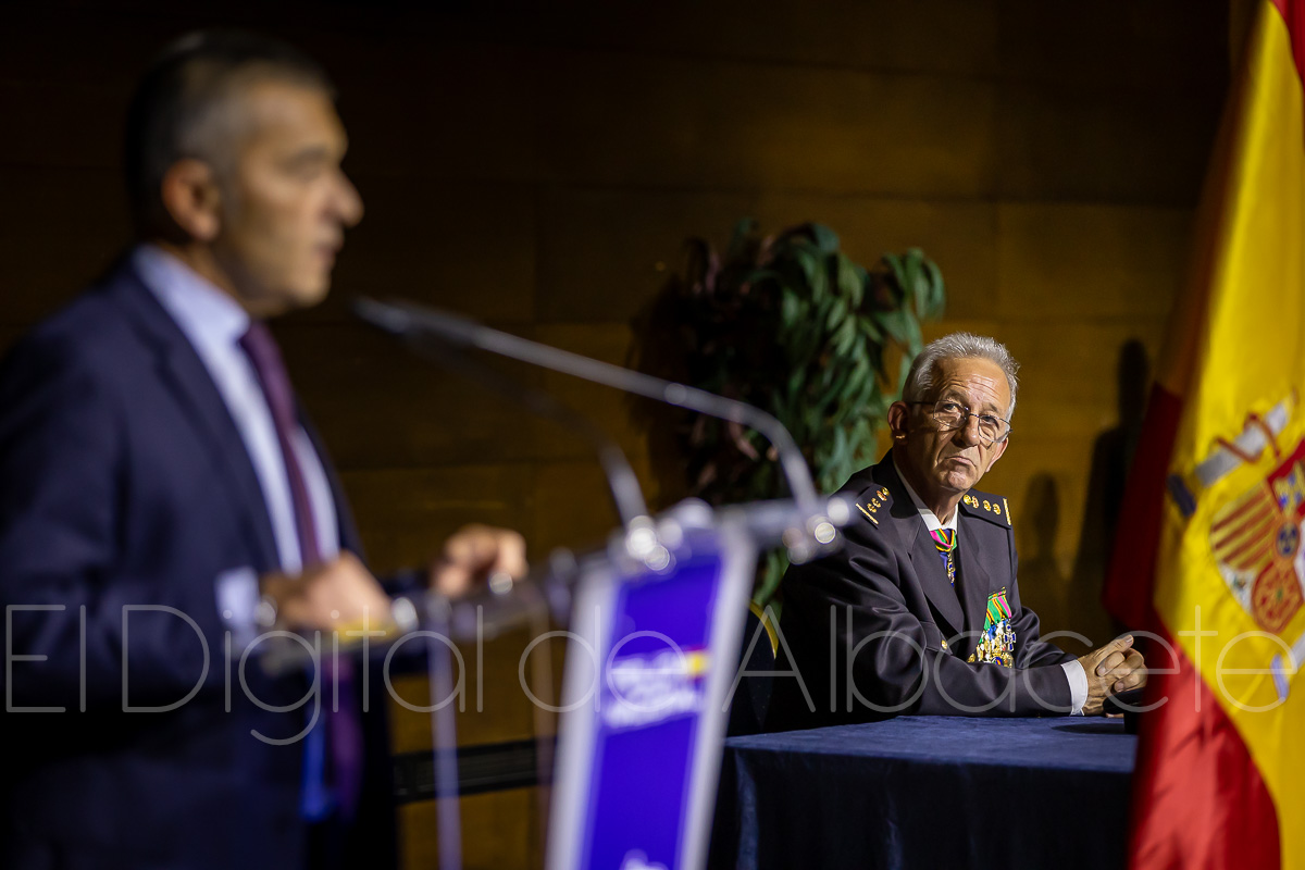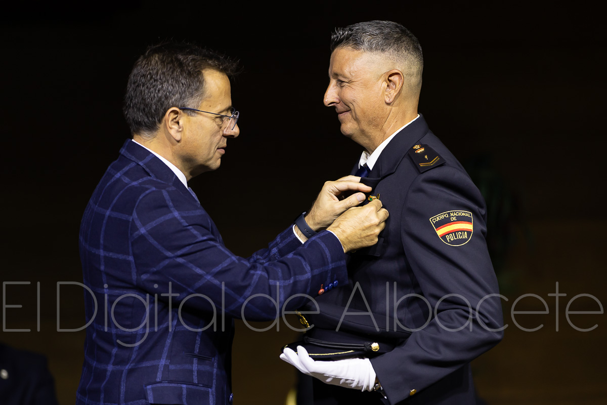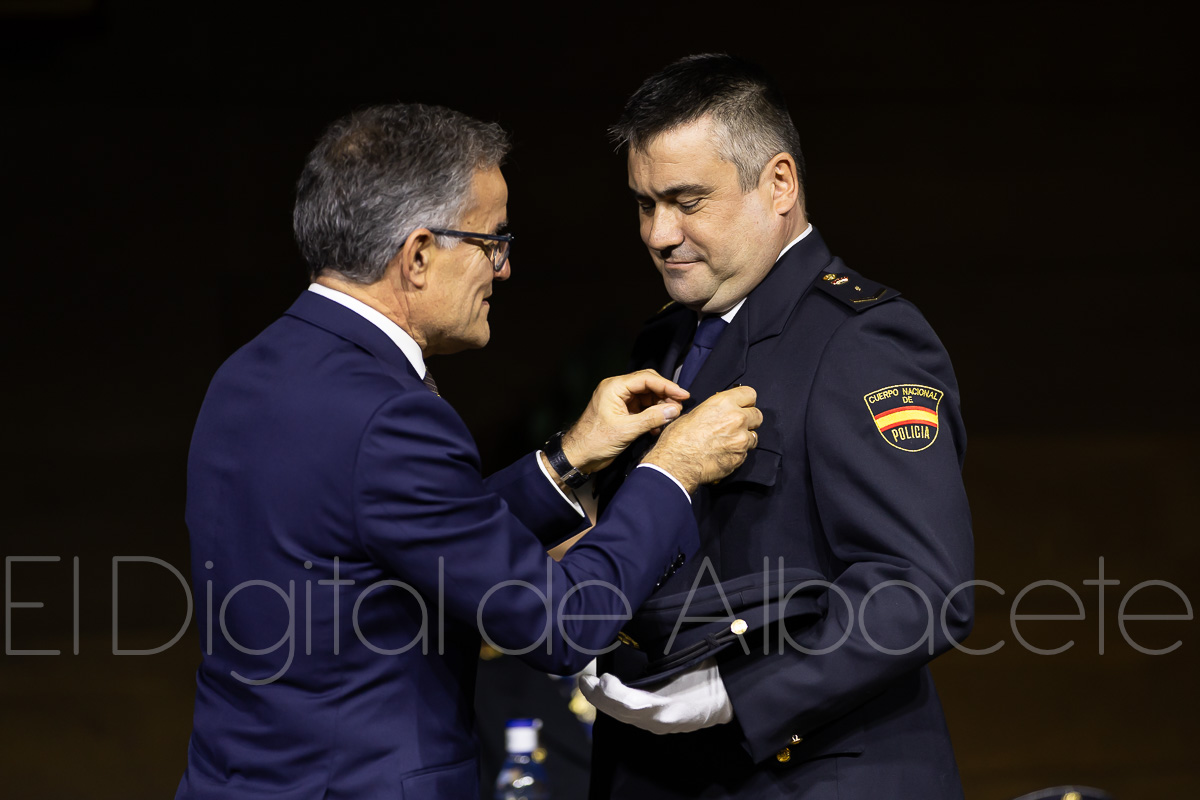 Durante el acto, la Policía Nacional reconocía el trabajo y la labor de un total de 20 personas, haciendo entrega de una veintena de condecoraciones policiales. En concreto, 19 de estas distinciones contaban con el distintivo blanco y una de plata que se entregaba al Comisario Alfredo Garrido, natural de Cenizate (Albacete) y que tras cumplir con su servicio en el Cuerpo Nacional de Policía “ha tenido a bien que le impongamos esta condecoración aquí en Albacete”, explicaba Antonio Bueno. Al respecto, sostenía que “ha sido un privilegio y un honor que él haya decidido que le demos este distintivo en Albacete”, y es que estaba previsto que fuera condecorado en los Actos Centrales de la Policía que se celebran este año en Vigo.