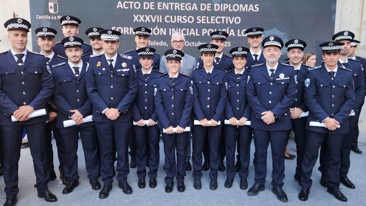 El concejal de Seguridad Alberto Reina, acompañado de los inspectores jefes de la Policía Local Mario Rubio y Luciano Rosillo, han asistido en Toledo a la clausura y acto de graduación del XXVII Curso de Formación Inicial para policías locales de Castilla Mancha, en el que han participado 15 nuevos agentes del cuerpo en Albacete.