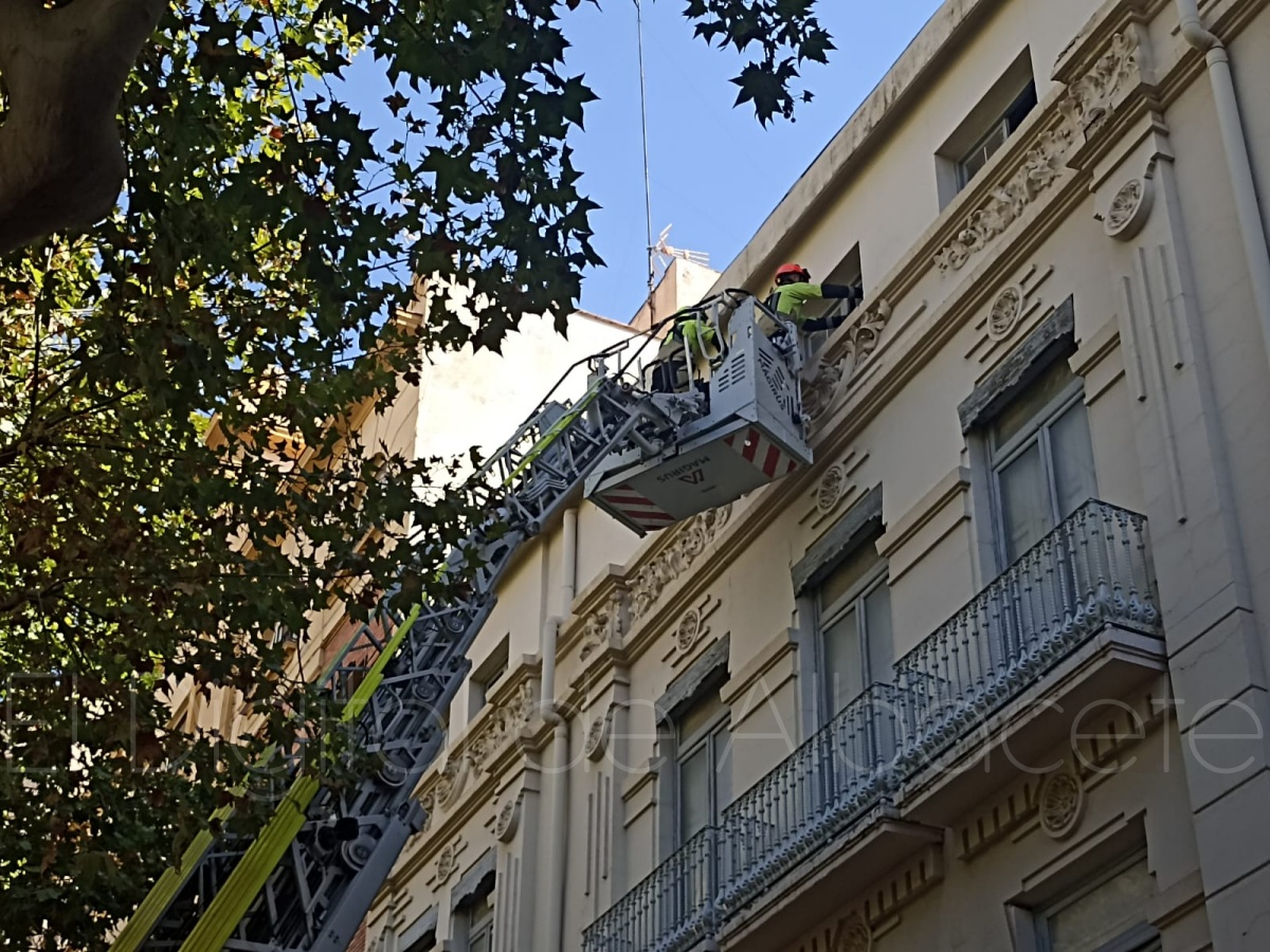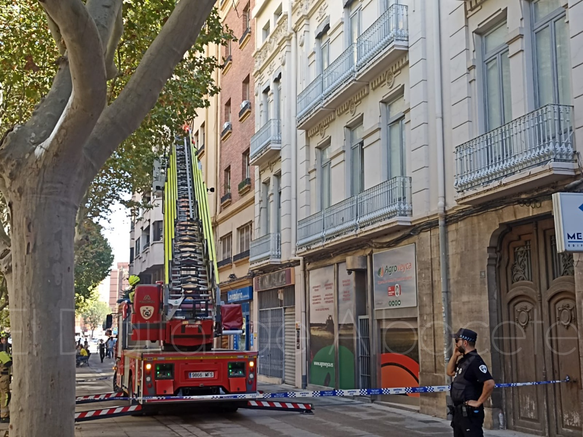 Desplazados al lugar de los hechos la policía local y los bomberos, han sido estos últimos los que han tomado la voz cantante en la actuación de saneamiento de la fachada afectada en este mítico punto de Albacete capital.