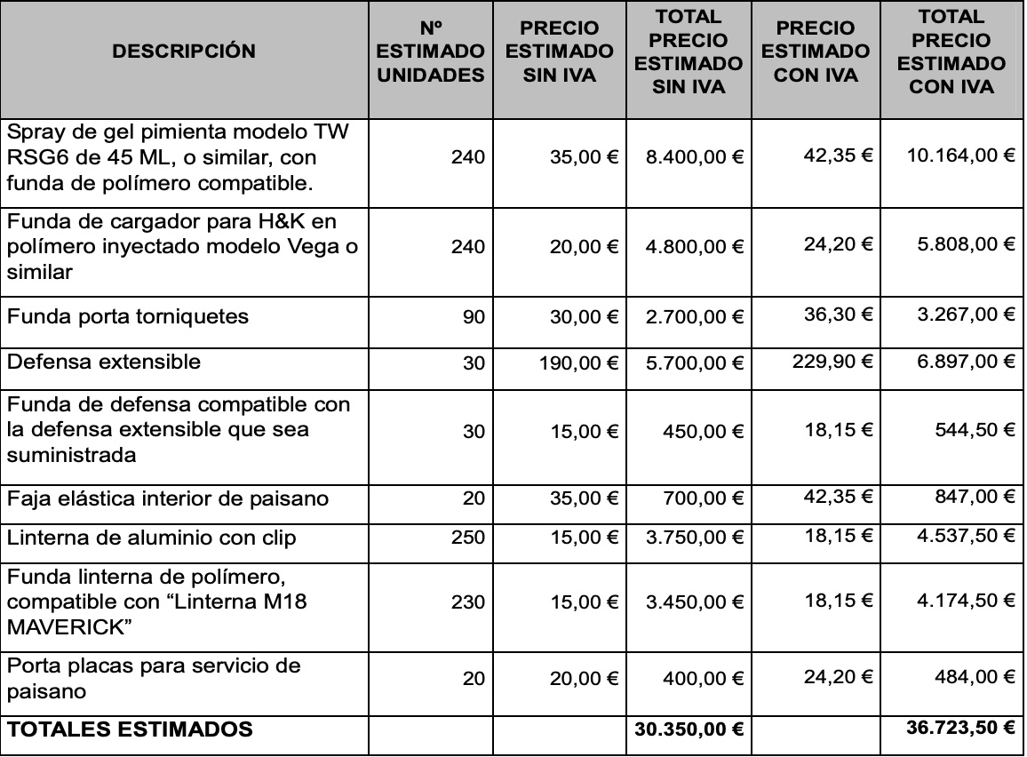El contrato incorpora, entre otros, 240 sprays de gel pimienta con funda, 240 fundas de cargador, 90 fundas porta torniquetes, 30 defensas extensibles ASP F21 con sus fundas rotatorias, 20 fajas elásticas de paisano, 250 linternas de aluminio con clip y 230 fundas de linterna de polímero, además de 20 porta placas para servicio de paisano. El presupuesto estimado de estos lotes alcanzaba 30.350 euros sin IVA (36.723,50 con IVA).