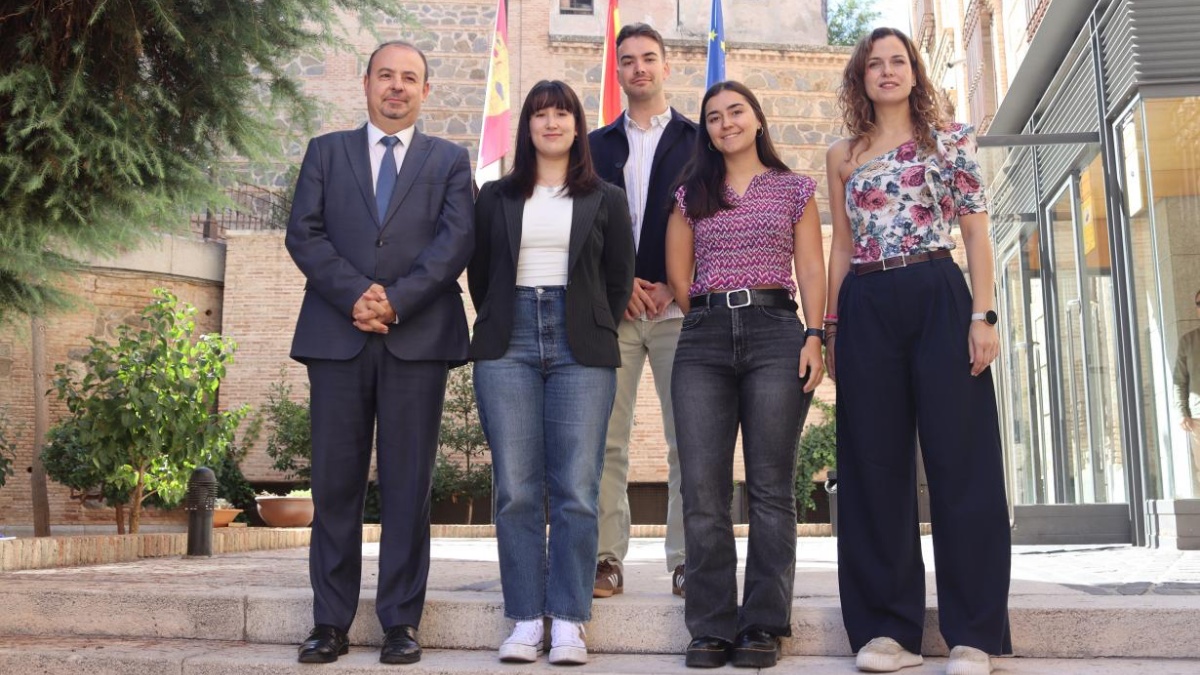Tres nuevos becarios que se incorporan ahora y que han sido recibidos en Toledo por la directora general de Asuntos Europeos, Nazareth Rodrigo, y por el viceconsejero de Relaciones Institucionales, Javier Vicario.