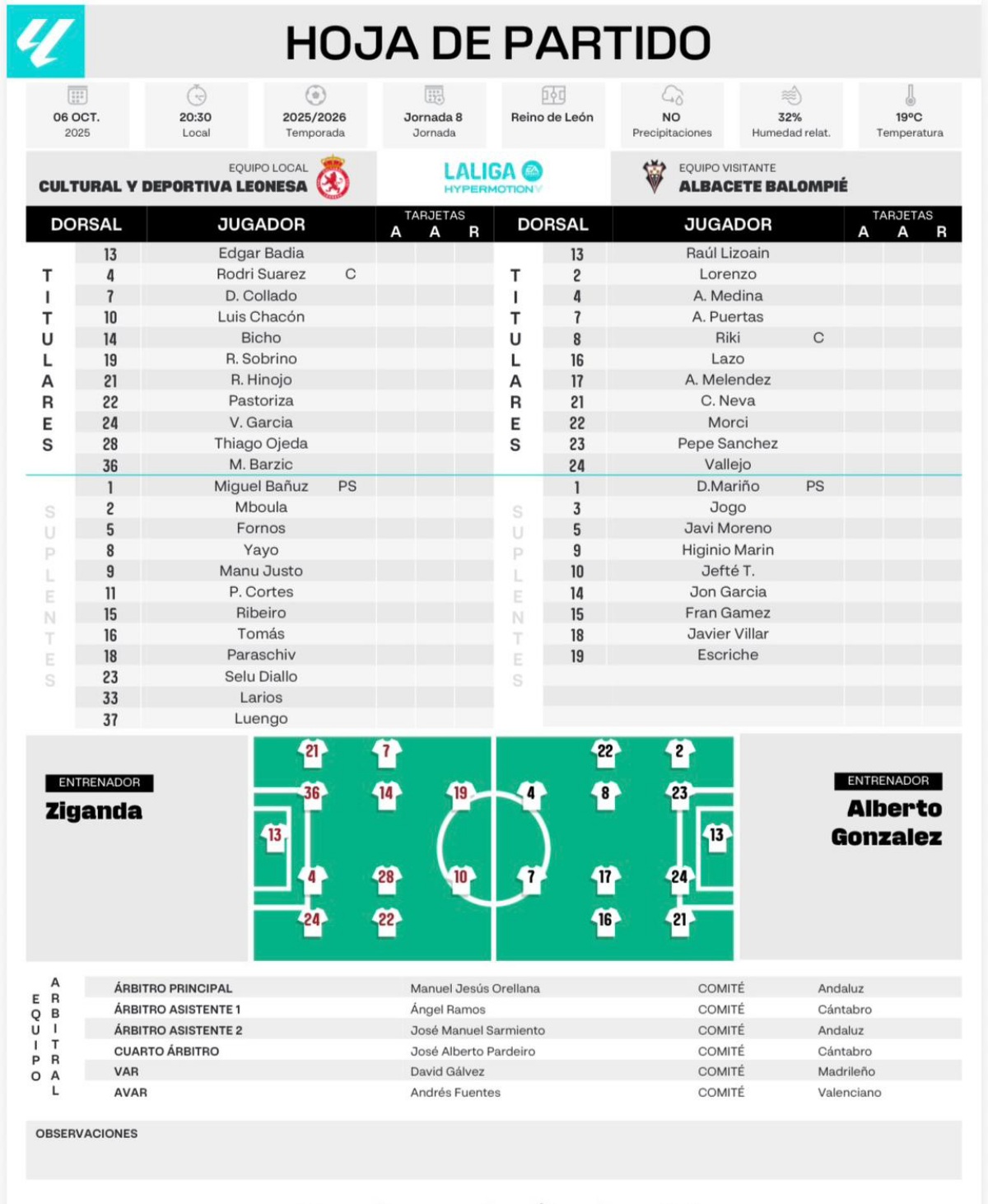 Por parte de la Cultural y Deportiva Leonesa, el ‘Cuco’ Ziganda apostó por un once compuesto por Edgar Badía en portería; García, Suárez, Barzic e Hinojo, en defensa; Pastoriza, Ojeda, Bicho y Collado, en el centro del campo; y Chacón y Sobrino, en ataque.
