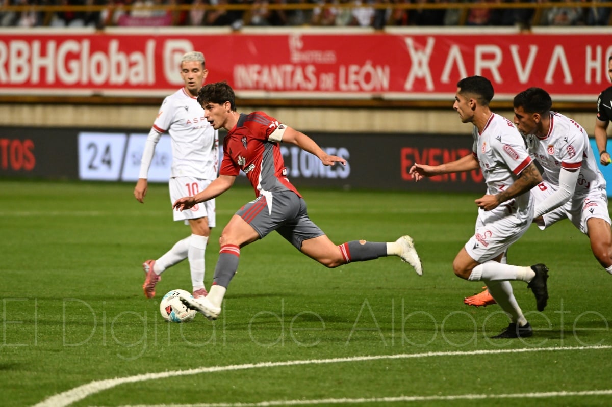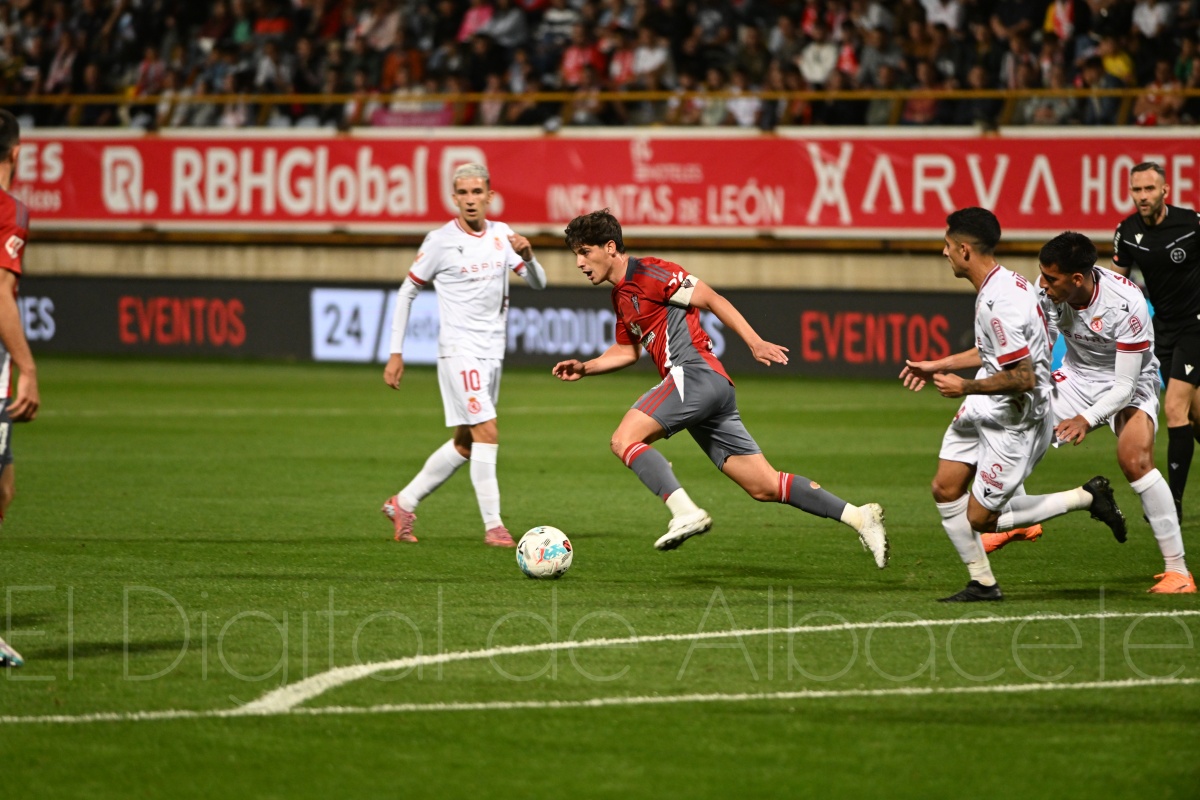 Puntual a las 20.30 horas el balón echó a rodar sobre el verde del Reino de León, y lo hizo con un Albacete que a los 5 minutos pudo haberse adelantado con un tanto que a buen seguro habría sido el gol de la jornada y, quien sabe, quizá el de la temporada. Corría como decimos el minuto 5 de partido y Jon Morcillo recibió un balón en campo propio y a media distancia entre el área de Lizoain y la linea central del terreno de juego, viendo el vasco adelantado a Edgar Badía y tirando desde ahí un misil parabólico que se fue envenenando a marchas forzadas y que se terminó estrellando en el larguero de la portería local. De haber perforado las mallas, el gol de Morci habría entrado en los anales de la historia por su belleza y dificultad, pero unos milímetros impidieron el tanto del ’22’ albacetista y la alegría en La Mancha.