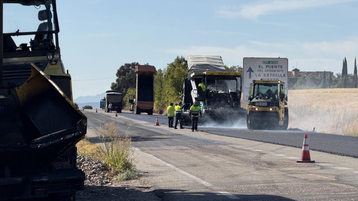 El Gobierno de Castilla-La Mancha va a concluir a finales de este mes de octubre la rehabilitación del firme de la carretera CM-4100 entre las localidades toledanas de Oropesa y Puente del Arzobispo. Así lo ha confirmado el director general de Carreteras, David Merino, quien ha visitado las obras junto con los alcaldes de Oropesa y de Puente del Arzobispo, Rubén Zapardiel, y Rocío Castro, respectivamente; el delegado de la Junta en Talavera de la Reina, David Gómez; y el delegado de Fomento en Toledo, Jorge Moreno.