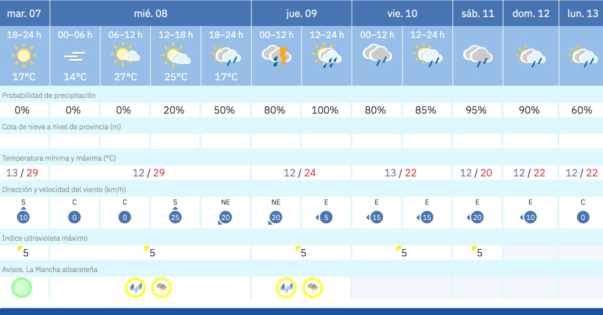 Según el pronóstico de Aemet, el tiempo se mantendrá estable hasta el miércoles, con cielos despejados y temperaturas máximas de hasta 29 ºC. Sin embargo, la situación cambiará bruscamente el jueves con la entrada de aire frío en altura asociado a la DANA, que provocará precipitaciones generalizadas e intensas en el sureste de Castilla-La Mancha, especialmente en la provincia de Albacete.
