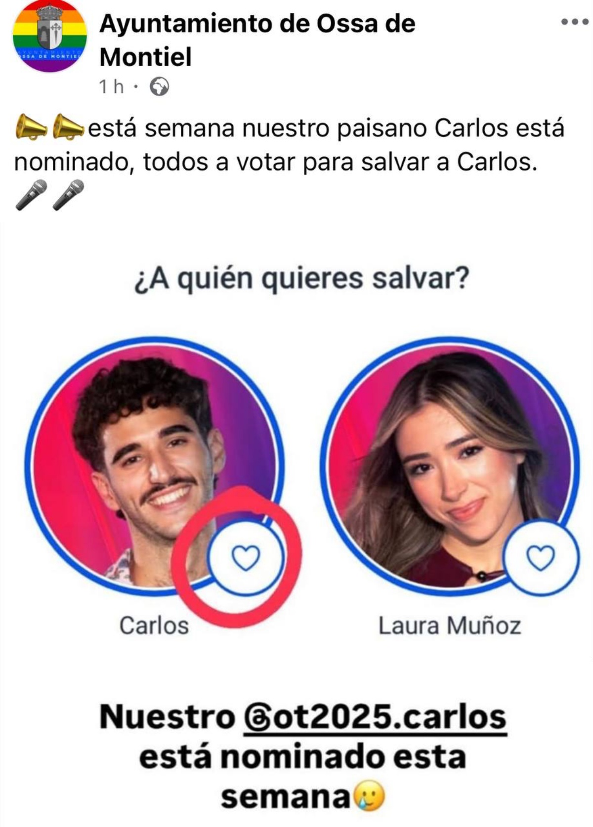 Así, este pueblo de la provincia de Albacete, que guarda las raíces de la familia de Carlos, se ha volcado con el triunfito. De este modo, el Ayuntamiento de Ossa de Montiel ha trasladado a través de sus redes sociales que “esta semana nuestros paisano Carlos está nominado”, animando a los vecinos a “votar para salvarlo”.