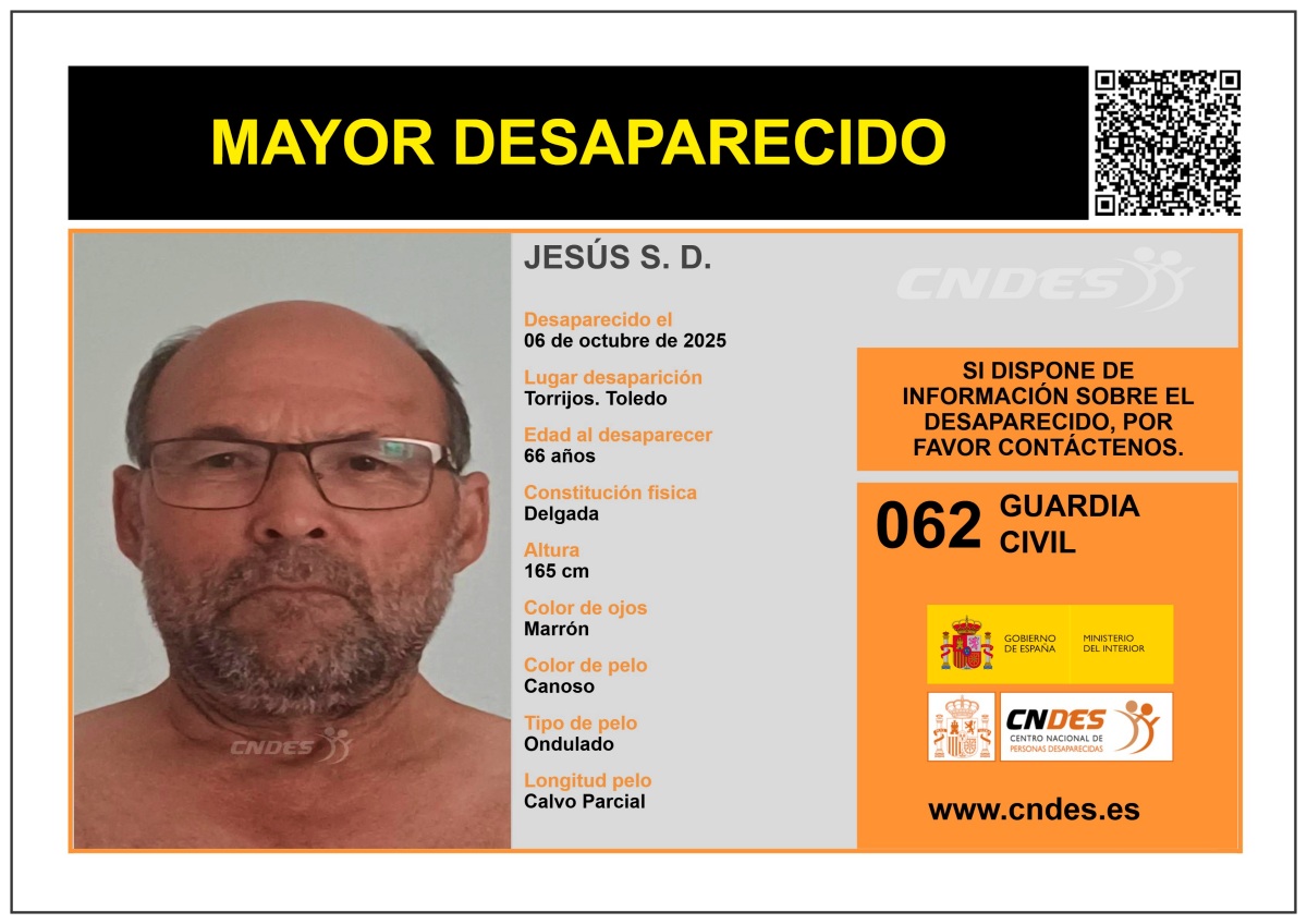 Así las cosas, la Guardia Civil y el Centro Nacional de Desaparecidos solicitan la colaboración ciudadana para localizar a Jesús S. D., de 66 años de edad, desaparecido el 6 de octubre de 2025 en Torrijos (Toledo, Castilla-La Mancha).