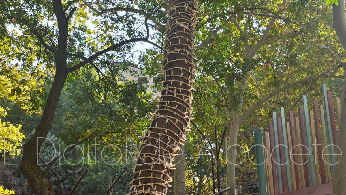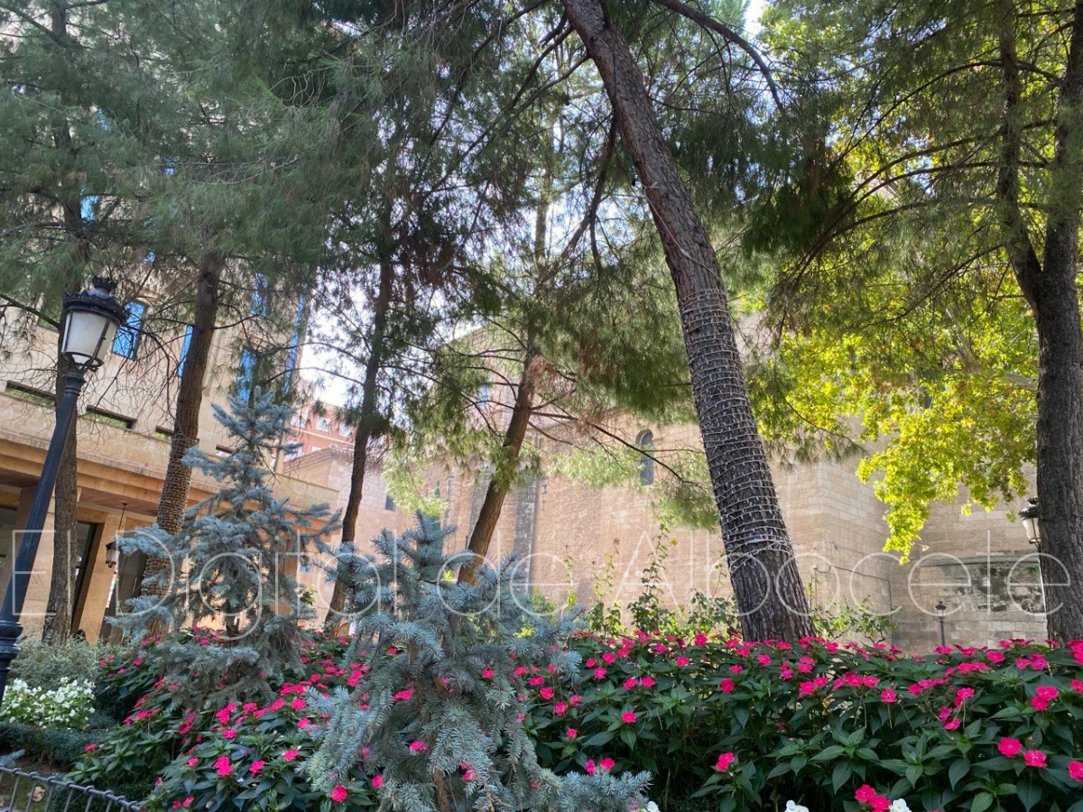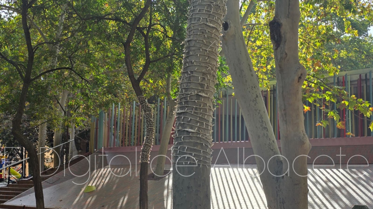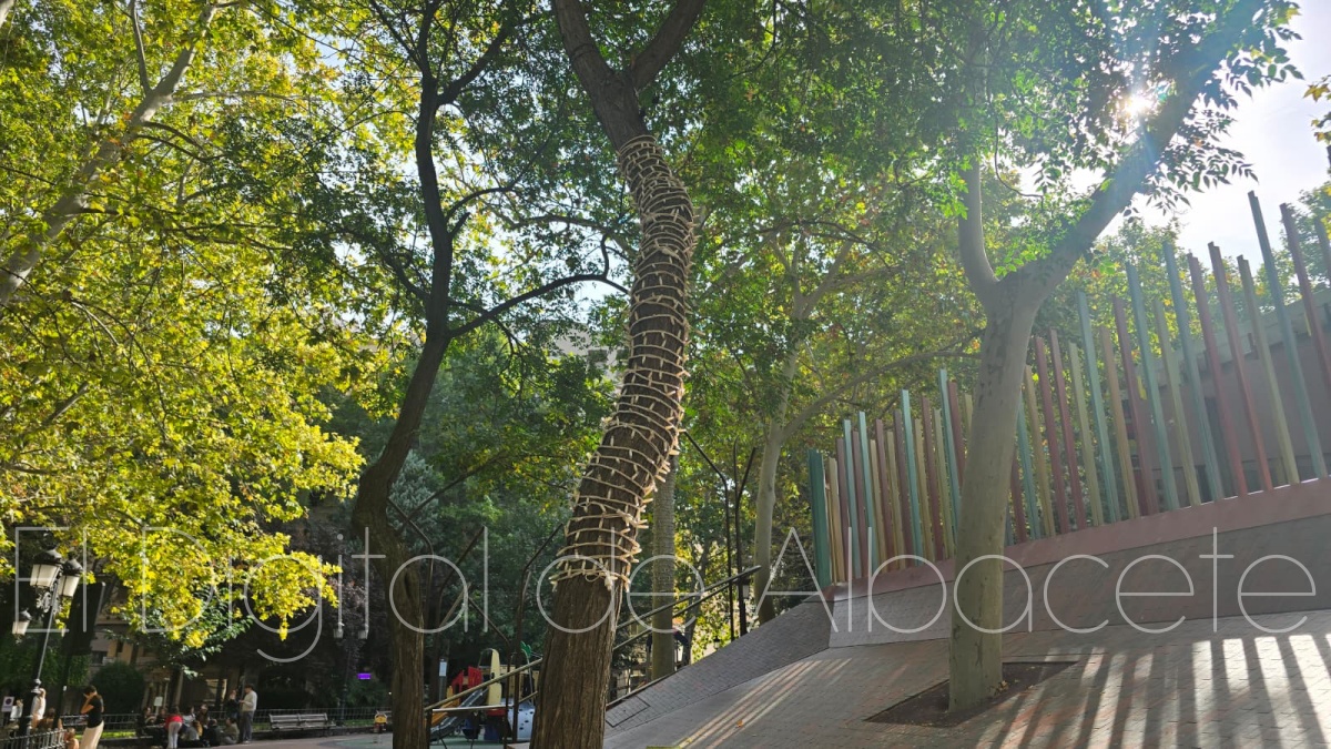 Durante los próximos días continuarán las labores de los operarios para engalanar la ciudad para la próxima Navidad. Por el momento, esta zona verde del centro de la ciudad, ubicada entre el Consistorio albaceteño y el Museo de la Cuchillería, ya está preparada para brillar el próximo mes de diciembre.