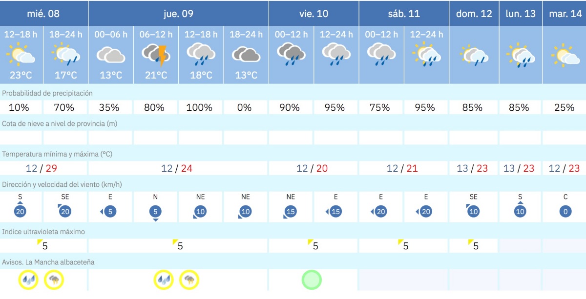Paras todas estas comarcas de las provincias de Albacete y Cuenca, AEMET también ha emitido avisos de nivel amarillo por tormentas, que podrán ir acompañadas de granizo, no descartándose que localmente sea de gran tamaño. Todos los avisos tienen como hora de inicio las 17:00 horas.