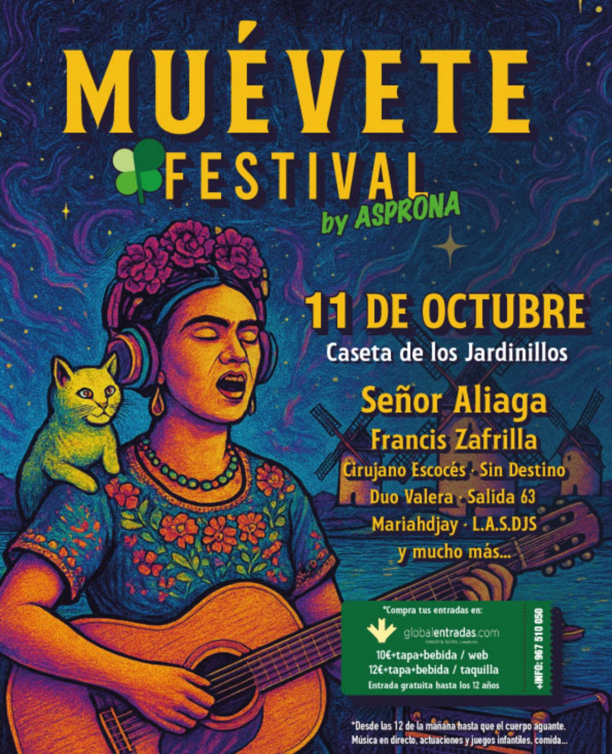 Este sábado, 11 de octubre, tendrá lugar el Festival Muévete, organizado por Asprona en la Caseta de los Jardinillos, donde habrá diversas actuaciones, entre ellas, el Señor Aliaga, La Chica Charcos o Francis Zafrilla, entre otros. Las entradas tienen un precio solidario de 10 euros entrada anticipada y 12 euros en taquilla, y ya están disponibles en las Oficinas de ASPRONA (C/ Pedro Coca, 21 – Albacete) o en este enlace.