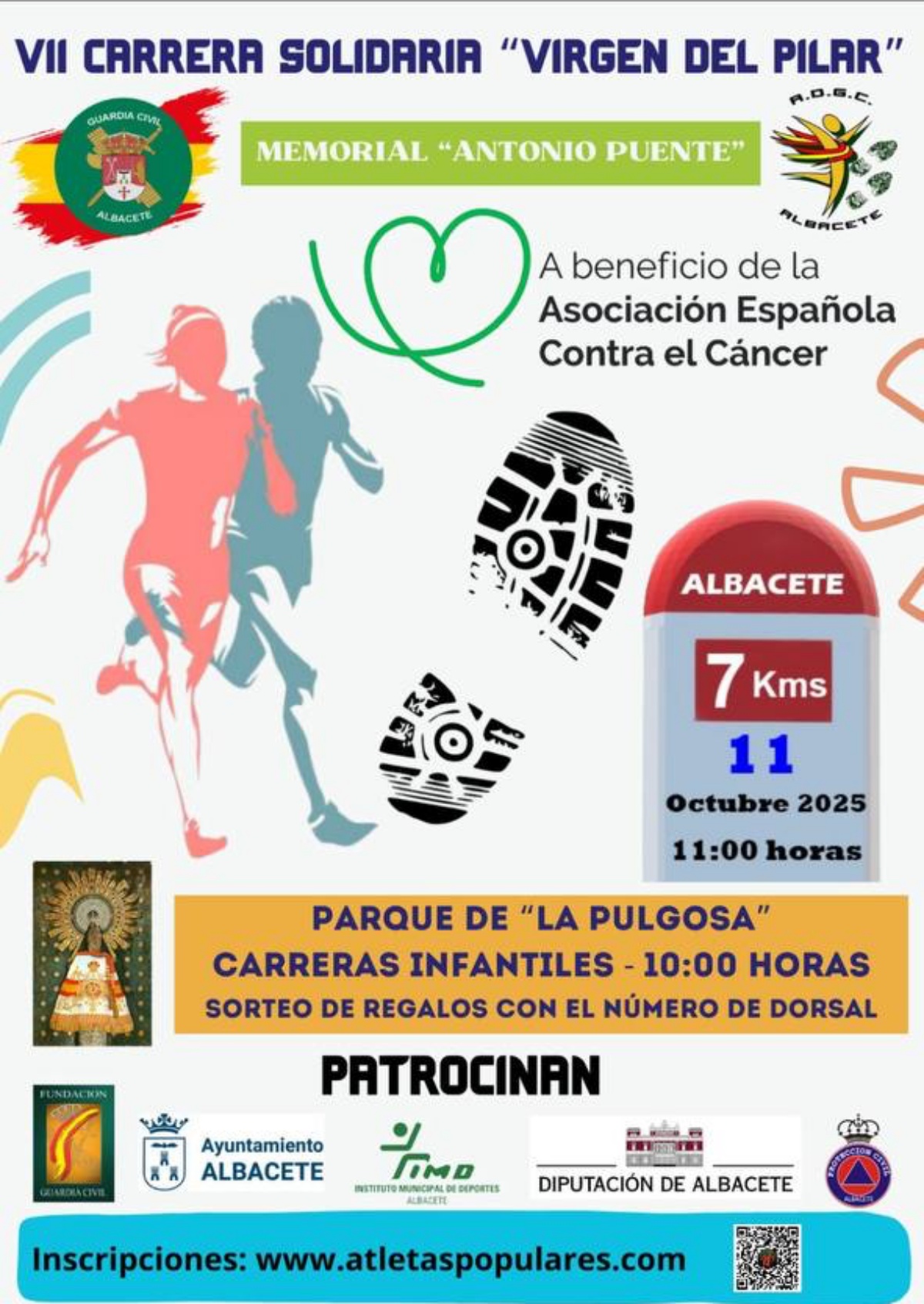 La Guardia Civil de Albacete organiza la VII Carrera Solidaria ‘Virgen del Pilar’ y el Memorial ‘Antonio Puente’ a beneficio de la Asociación Española Contra el Cáncer. A las 10 horas atendrán lugar las carreras infantiles y a las 11 horas arrancará la carrera oficial en el Parque de La Pulgosa de Albacete, donde recorrerán 7 kilómetros solidarios.
