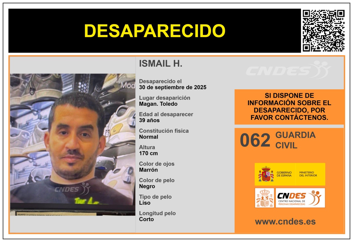 Así las cosas, el Centro Nacional de Desaparecidos (CNDES), organismo del Ministerio del Interior, ha difundido una alerta para localizar a Ismail H., desaparecido el 30 de septiembre de 2025 en Magán (Toledo).