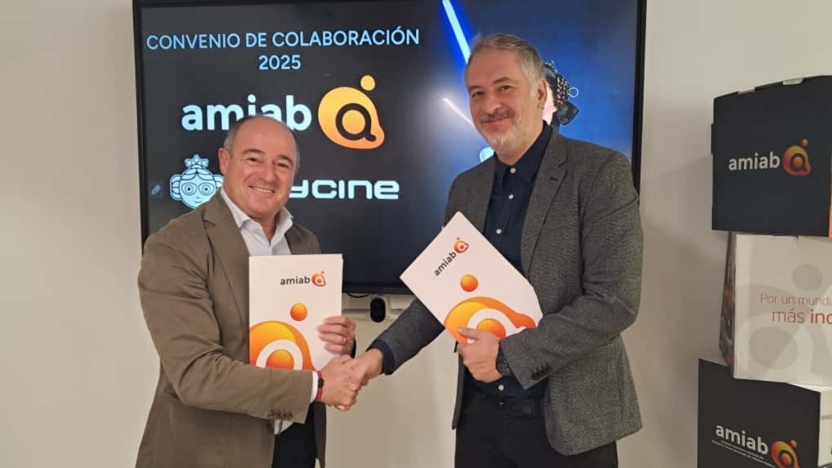El presidente de Amiab, Emilio Sáez, y José Manuel Zamora, director general de Abycine, han firmado en la mañana del lunes 13 de octubre un convenio de colaboración por el cual ambas entidades se comprometen a trabajar de la mano en apoyo del empleo de personas con discapacidad y/o riesgo de exclusión social, así como de la creación cinematográfica.