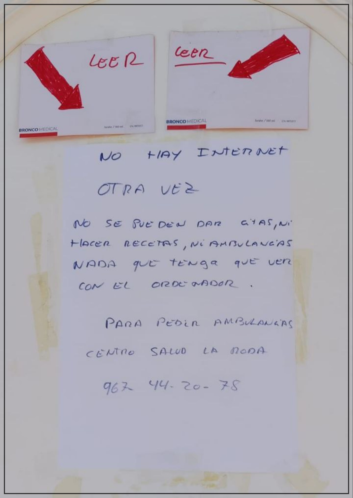 Como muestra del desconcierto creado en Minaya (Albacete) tras la caída del servicio de Movistar, en el consultorio médico se podía leer el siguiente cartel: “No hay internet otra vez. No se pueden hacer recetas, ni dar citas, ni ambulancias. Nada que tenga que ver con el ordenador. Para pedir ambulancias, llamar al Centro de Salud de La Roda al 967-44-20-78”.