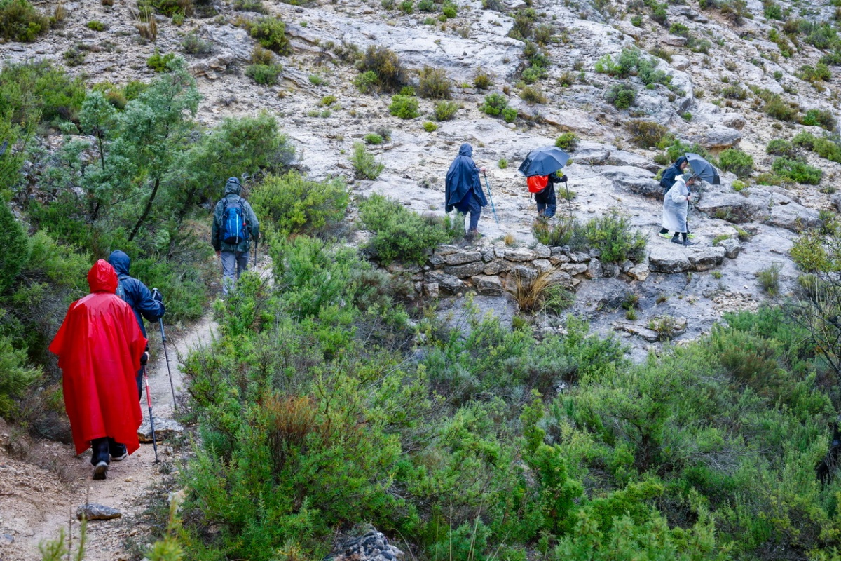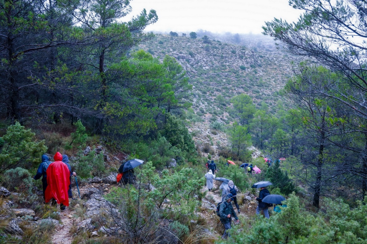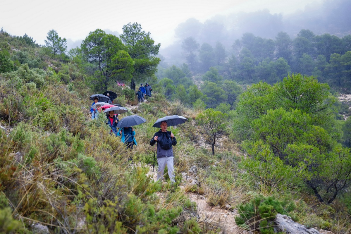 Empezaron sin lluvia, aunque según iban avanzando y adentrándose en la niebla empezó a llover, no con mucha intensidad, pero sí constante. Poco a poco iban cogiendo altura por esta senda, hasta la Cueva de los Collaos. Una vez aquí, el sendero comienza a descender hasta el fondo del Barranco de la Umbría, fueron encontrando gran cantidad de caleras, horno donde se calcina la piedra caliza para obtener cal.