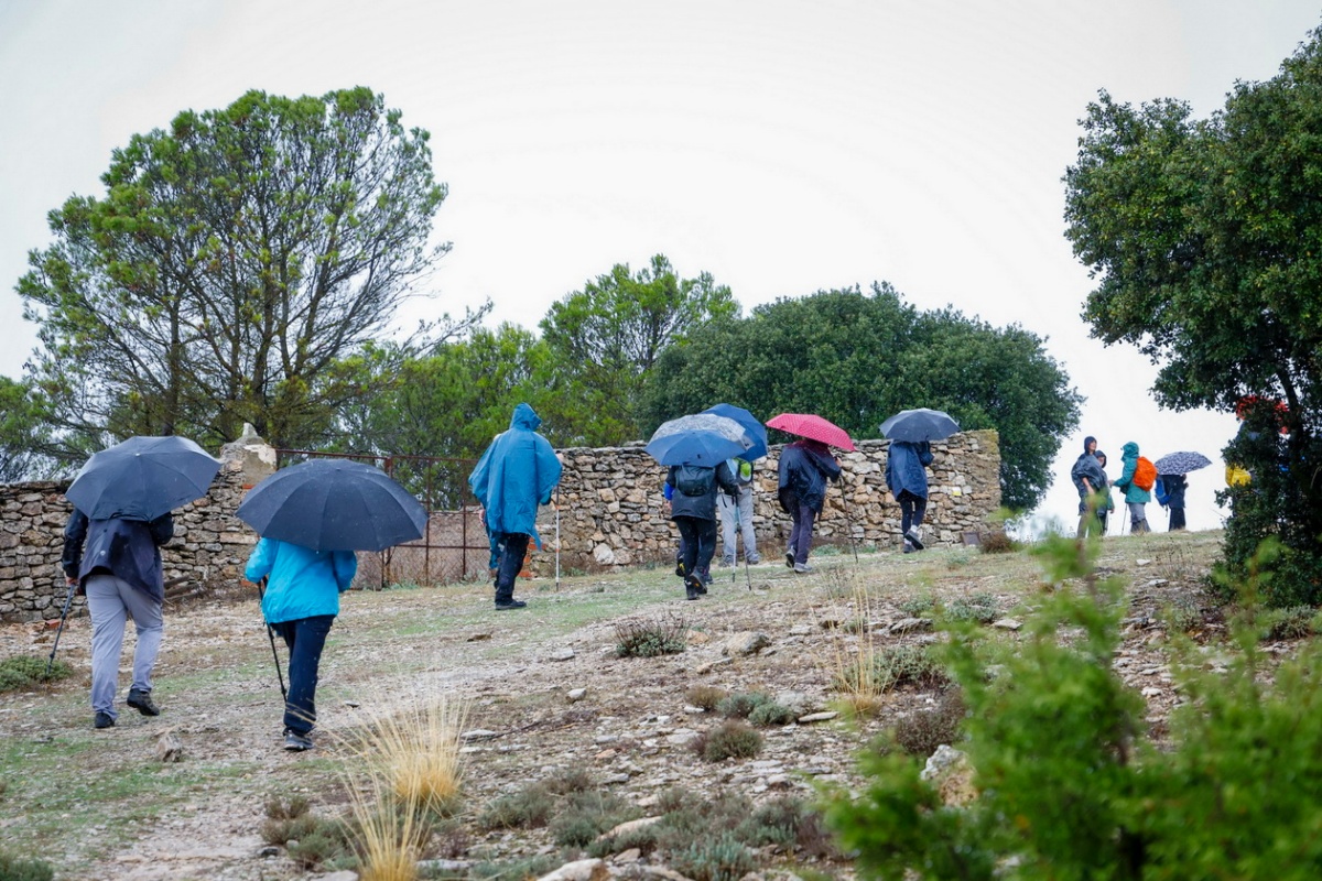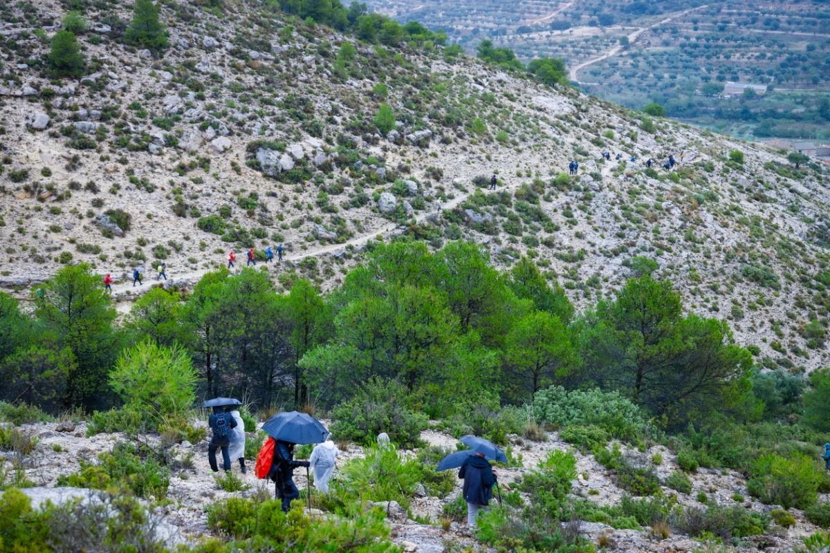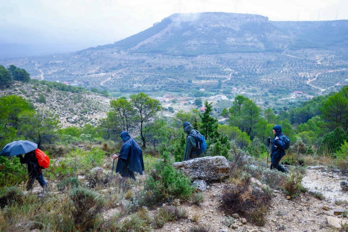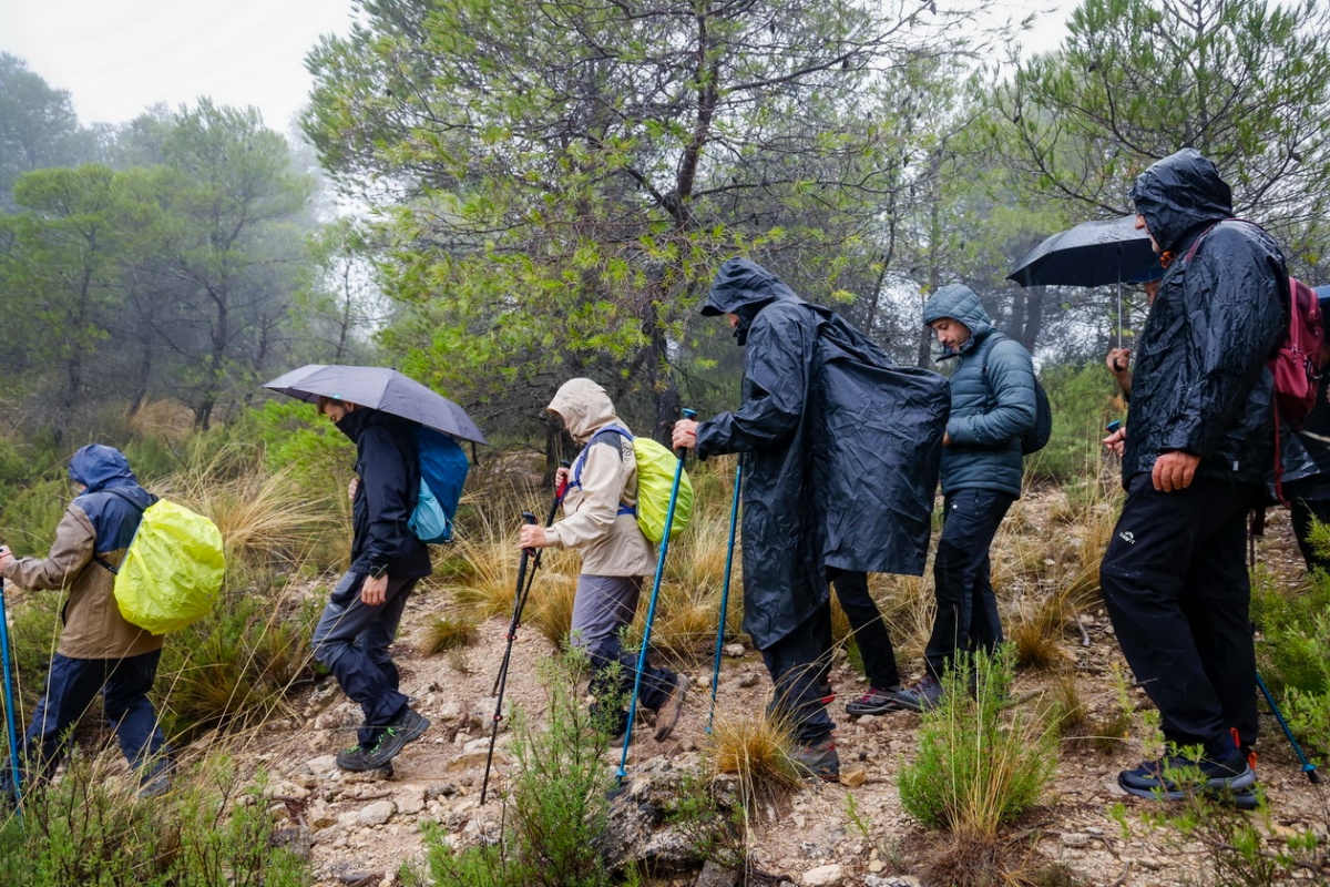Empezaron sin lluvia, aunque según iban avanzando y adentrándose en la niebla empezó a llover, no con mucha intensidad, pero sí constante. Poco a poco iban cogiendo altura por esta senda, hasta la Cueva de los Collaos. Una vez aquí, el sendero comienza a descender hasta el fondo del Barranco de la Umbría, fueron encontrando gran cantidad de caleras, horno donde se calcina la piedra caliza para obtener cal.