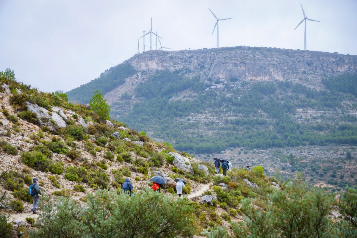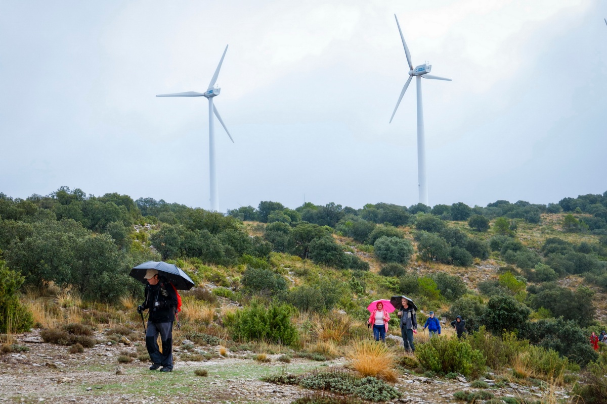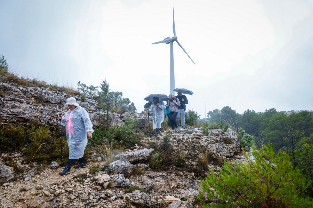 Comenzaron de nuevo el ascenso, tras pasar por la fuente “El Reguero de los Pollos”, con la lluvia que no cesaba. Aunque si se oían el girar de los aerogeneradores, en un principio, debido a la niebla no se veían, fue al llegar a la parte alta cuando se chocaron con ellos. Llegarían a un viejo corral de ganado, donde, ya de regreso al municipio, cogerían un camino que les conduce a otro collado que da vistas al pueblo de Carcelén y empezaría a bajar por una senda de herradura, hasta casi llegar al pueblo por un paraje conocido como Rincón de las Eras, a unos 300 metros de Carcelén. Llegarían así hasta el Lavadero municipal de Carcelén, junto a un espacio de recreo habilitado como zona de barbacoa y merendero. En este mismo lugar, se encuentra la fuente “Los Pimenteros”, lugar que aprovechamos para almorzar. La lluvia no paraba, por lo que decidieron no continuar andando y visitar el Castillo del Conde de Casal, con fantásticas vistas desde lo más alto de su gran torreón.