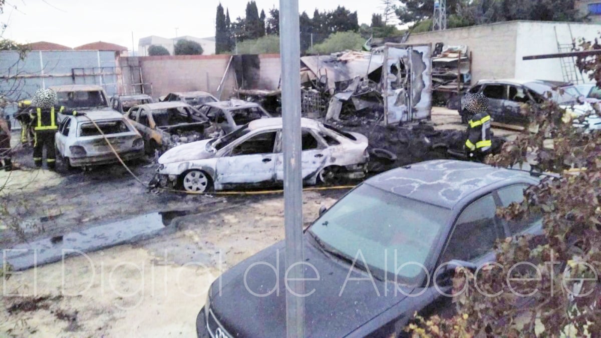 Las instalaciones exteriores de un taller mecánico situado en la avenida de Valencia de Caudete (Albacete) quedaron totalmente arrasadas en la madrugada de este miércoles a causa de un incendio que calcinó cinco vehículos y un remolque con alrededor de 200 neumáticos. No se registraron daños personales, según informó el 112 de Castilla-La Mancha.