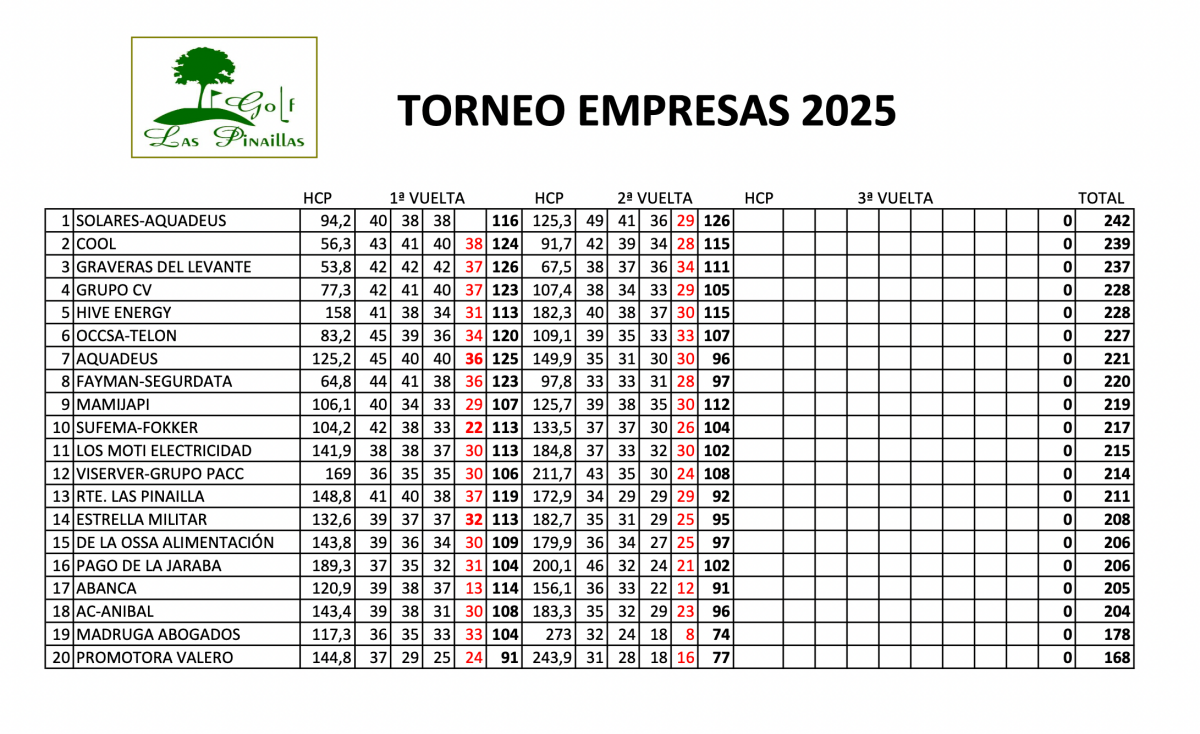 De cara a la tercera y última jornada que se disputa en la modalidad individual strokeplay, toman la delantera tres equipos con clara ventaja sobre el resto. En tercer lugar, el equipo Graveras del Levante, con una puntuación acumulada de 237 puntos. Seguidamente se sitúa Cool, con 239 puntos y que el año pasado ya quedaron segundos en un apretado desempate. Por ultimo, en primer lugar, jugará Solares-Aquadeus, que con 242 puntos iniciarán este ultimo día de juego en primera posición.