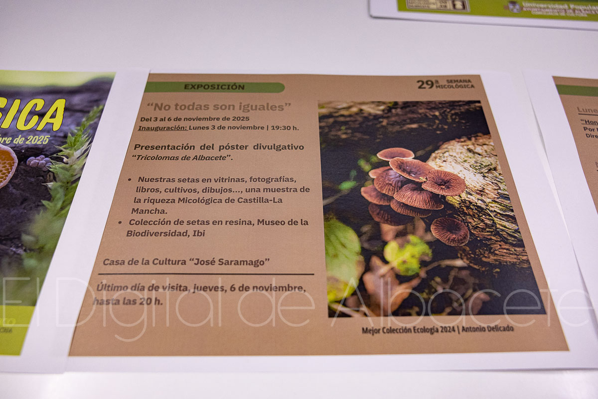 La 29ª Semana Micológica contará con una amplia programación. En la Casa de la Cultura José Saramago se inaugurará el lunes 3 de noviembre, a las 19:30 horas, la exposición ‘No todas son iguales’, que podrá visitarse hasta el 6 de noviembre y que mostrará vitrinas con setas, fotografías, libros, dibujos, cultivos y colecciones en resina, además de presentar el póster divulgativo ‘Tricolomas de Albacete’.