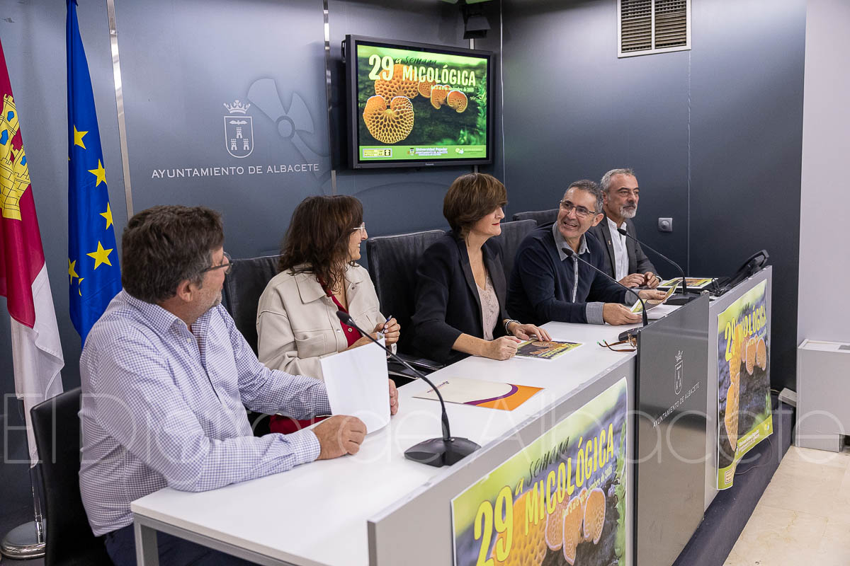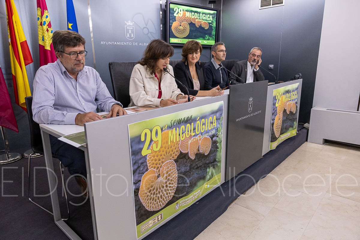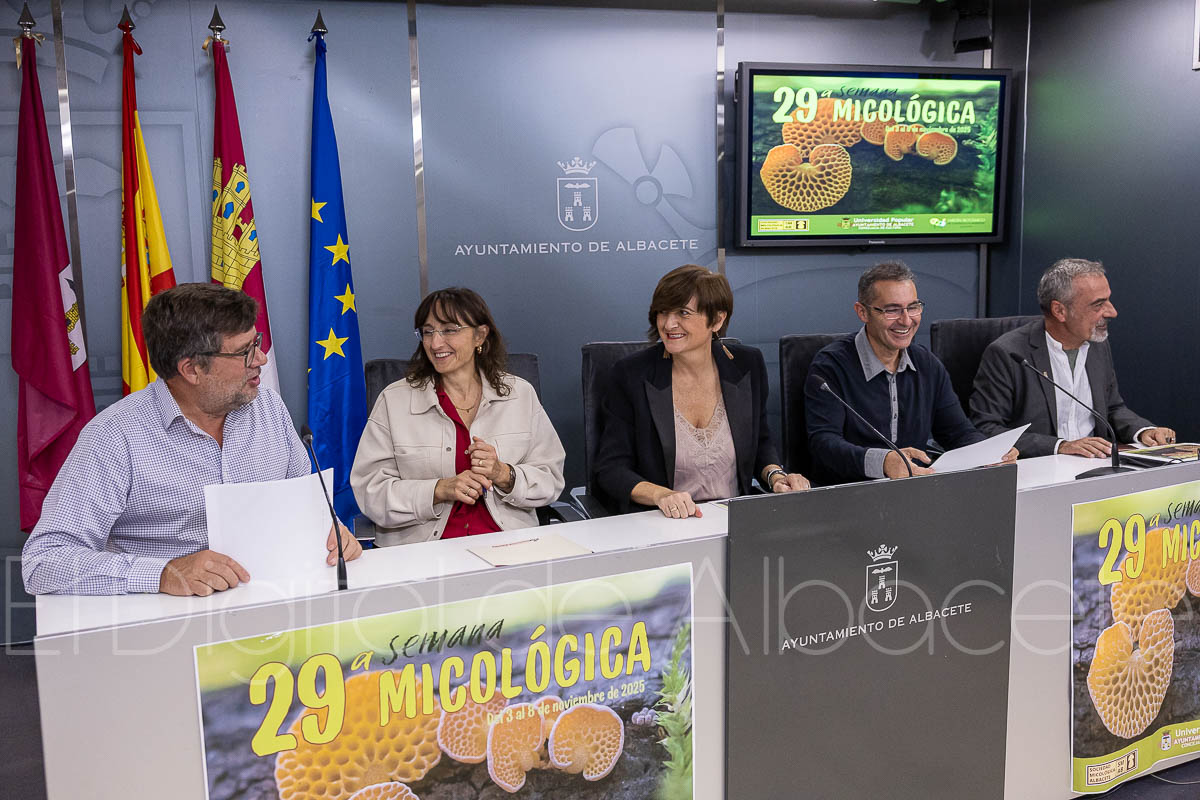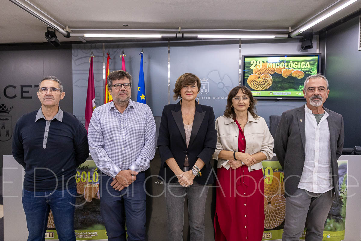La concejala de Cultura, Elena Serrallé, ha presentado la 29ª Semana Micológica de la Universidad Popular, que se celebrará del 3 al 8 de noviembre, junto a la directora de la UP, María José Jiménez; el director del Jardín Botánico, Pablo Ferrandis; José Fajardo, profesor del Aula de la Naturaleza de la UP; y José García, presidente de la Sociedad Micológica de Albacete.