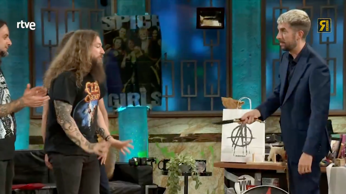 “No se puede ser más metalero”, subrayaba Broncano tras este nuevo descubrimiento sobre las raíces de los componentes de Angelus Apatrida. Pero la cosa no quedaba ahí, y los albaceteños recordaban al presentador una tradición que cumplía a rajatabla y es que “se dice que las navajas no se regalan, sino que se tiene que dar algo simbólico a cambio porque si no corta la amistad”, sacando del bolsillo Broncano una moneda para entregarla a cambio de este regalo tan albaceteño.