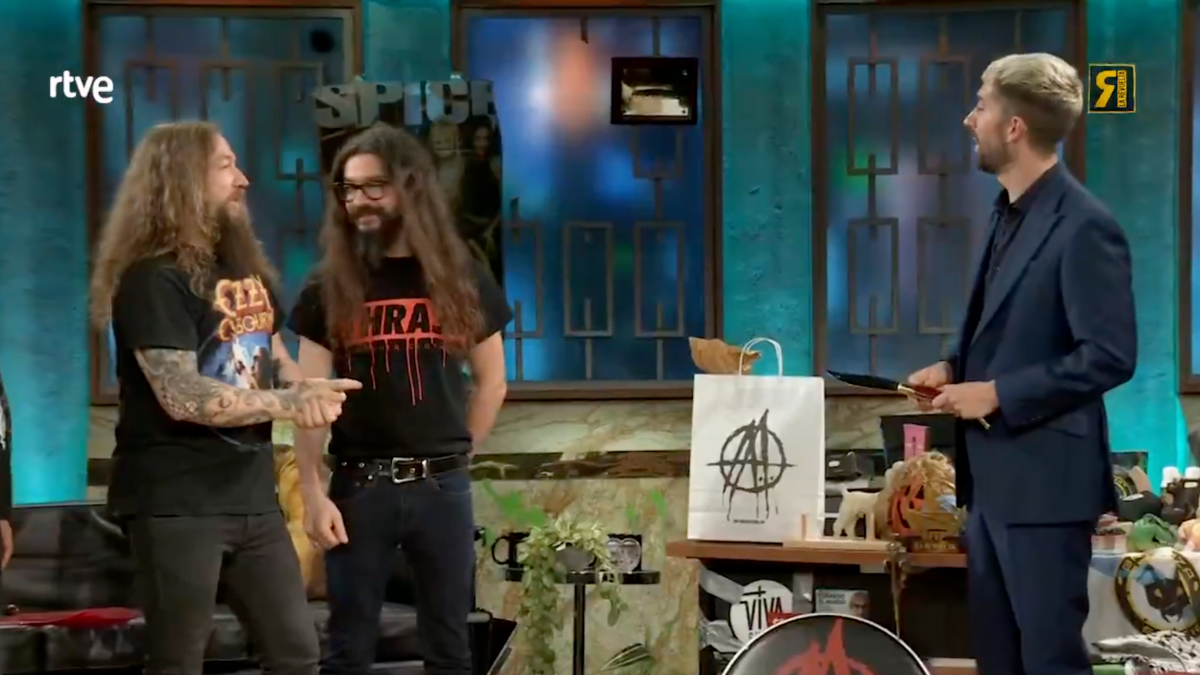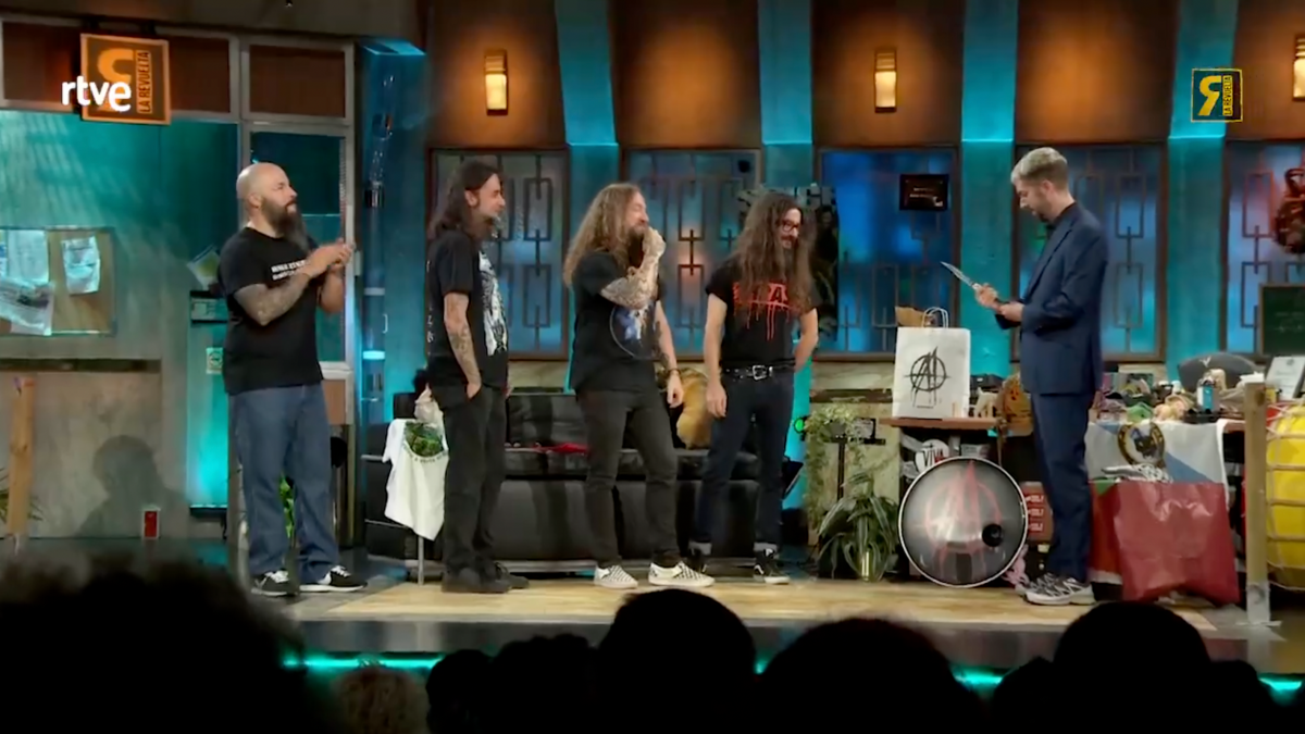 Los integrantes de Angelus Apatrida sorprendía a David Broncano durante su visita a La Revuelta. La banda de thrash metal llegaba a este televisivo espacio y hacía entrega de un regalo 100% de Albacete que dejaba sin palabras al conocido presentador.