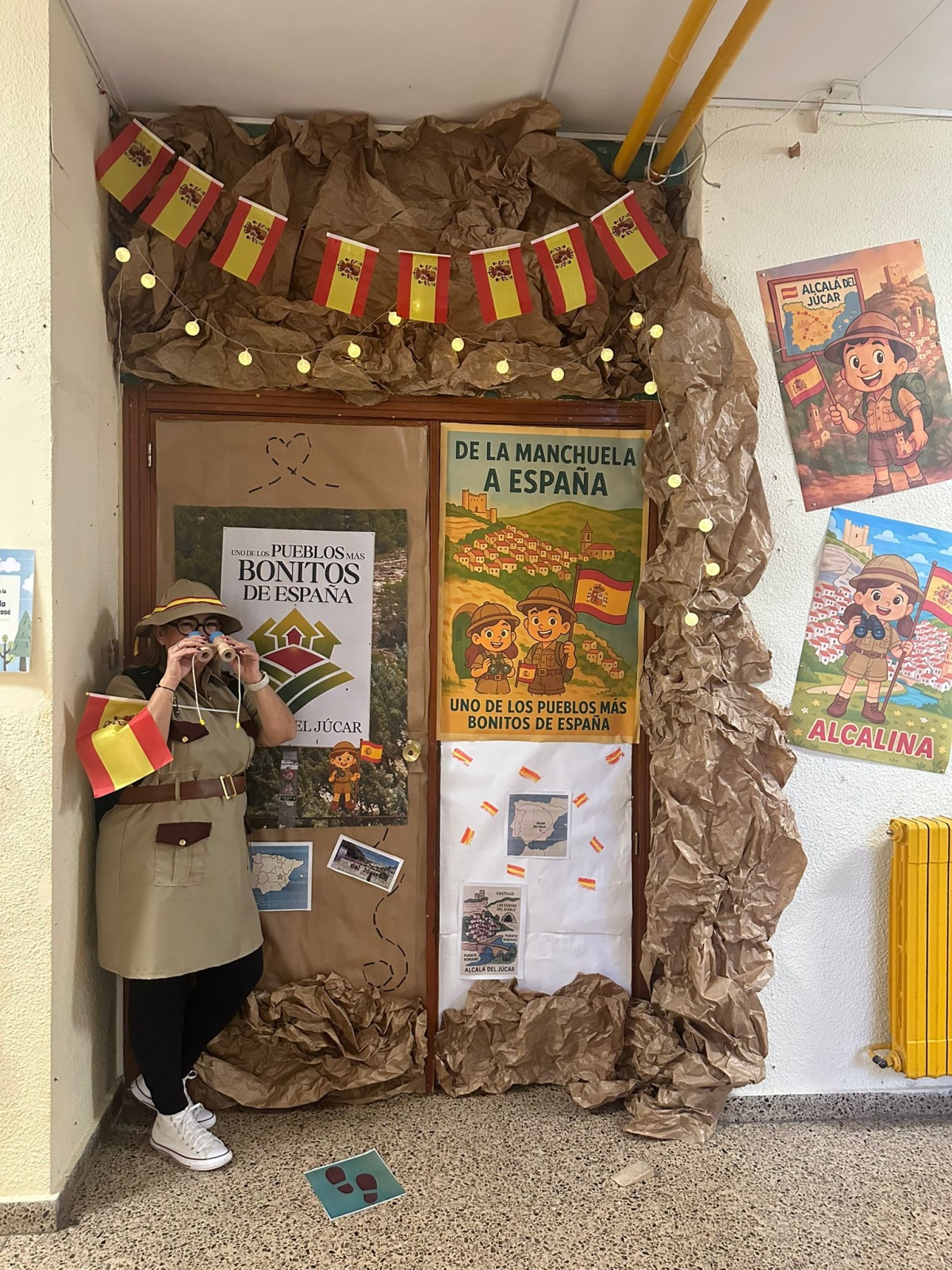 Un proyecto que está protagonizado por dos niños, creados por la docente, llamados Alcalín y Alcalina, que tienen su propia historia: “Son dos hermanos que se han mudado al pueblo porque sus padres vienen a trabajar y los alumnos tienen que hacer de guías turísticos para ellos”, explica. De este modo, los pequeños se han convertido en todo unos guías turísticos, encabezados por su profesora, también caracterizada con esta temática, y para ello ha recreado el pueblo “dentro de la clase”, apunta la docente.