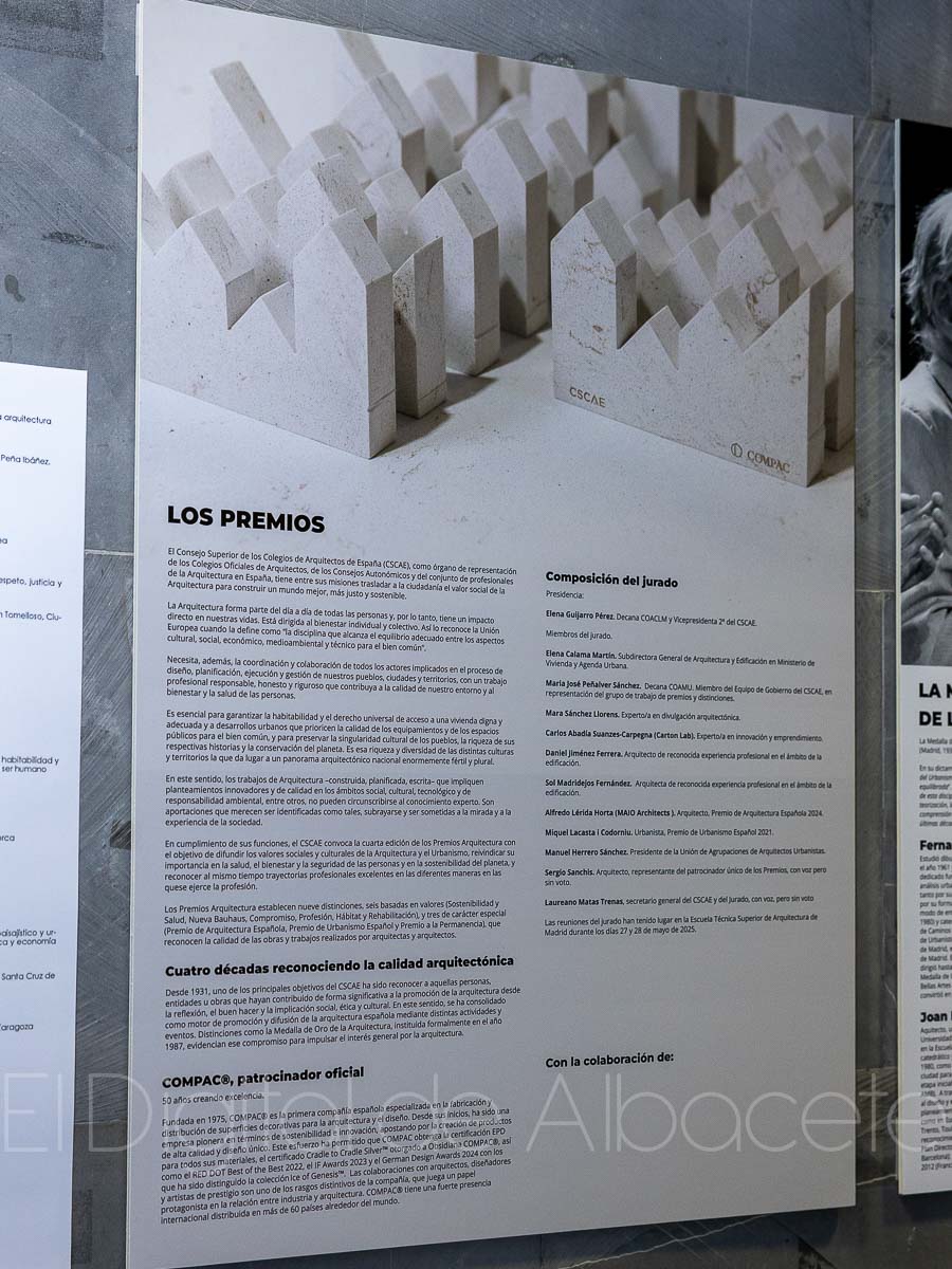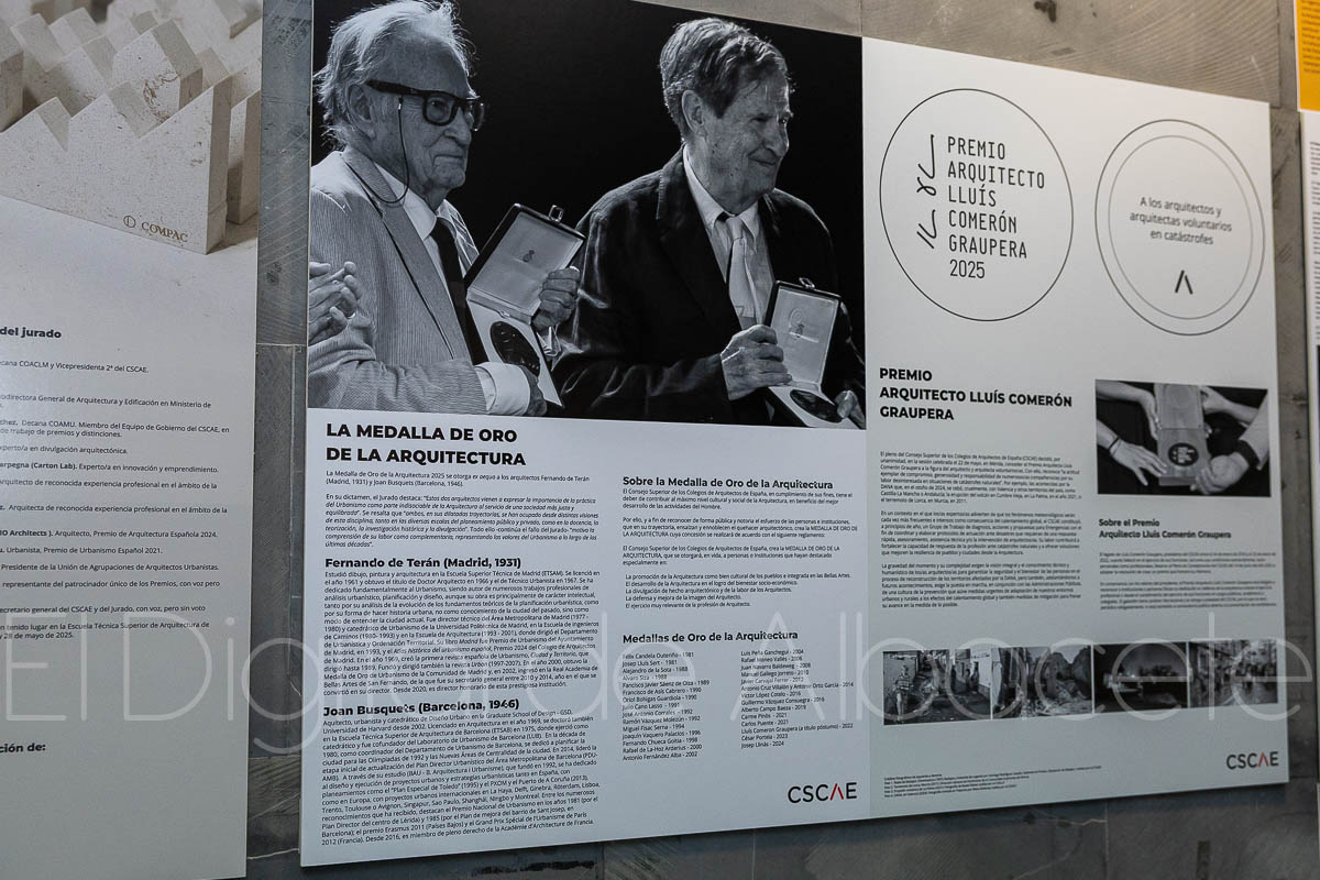 La documentación ha sido facilitada por el CSCAE e incluye la Medalla de Oro de la Arquitectura 2025, concedida ex aequo a los urbanistas Joan Busquets y Fernando de Terán, así como el Premio Arquitecto Lluís Comerón Graupera, otorgado al colectivo de arquitectos y arquitectas voluntarios en catástrofes naturales. En la apertura estuvo presente la decana del COACM, Elena Guijarro Pérez.