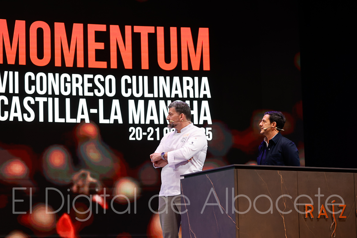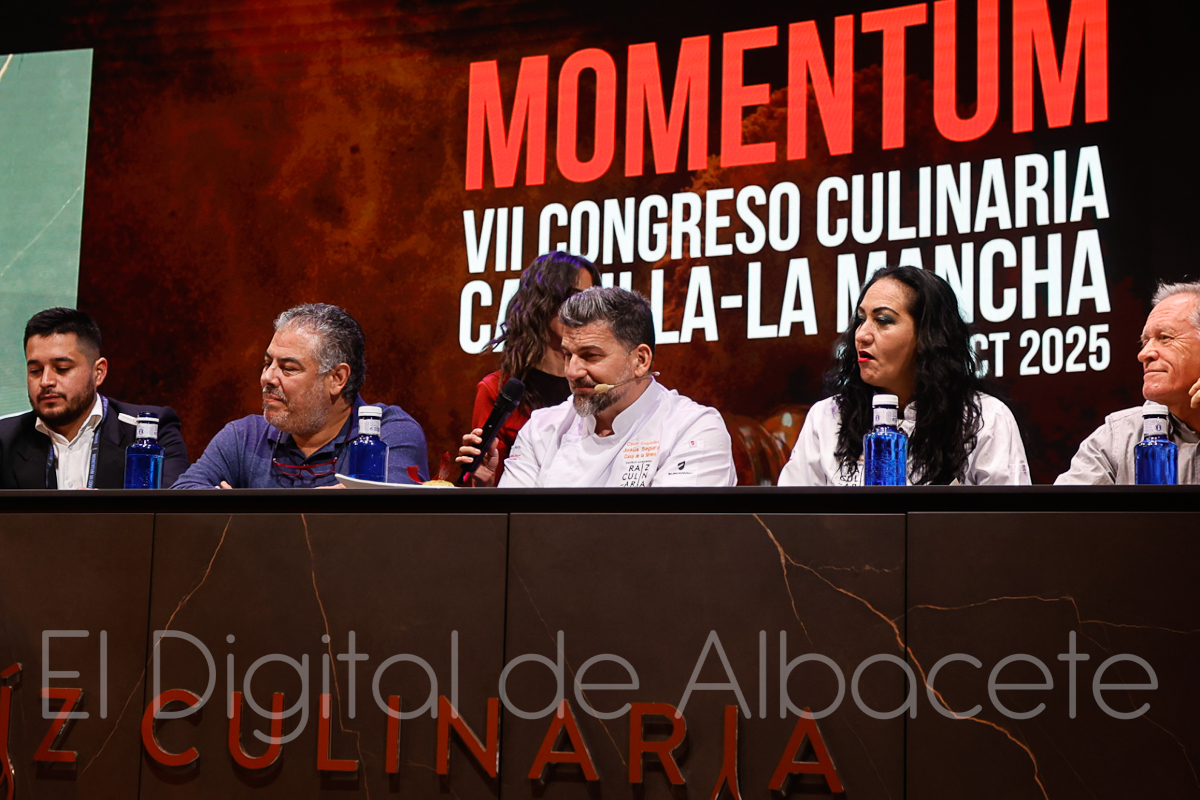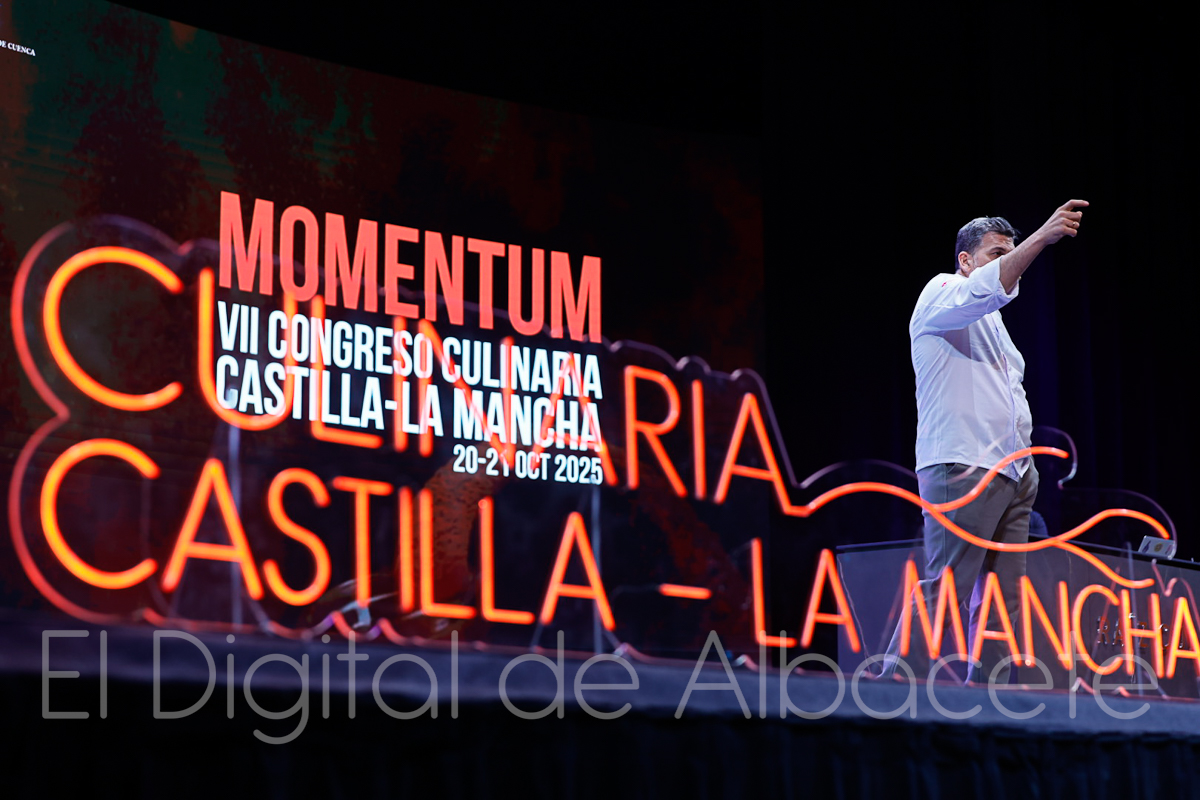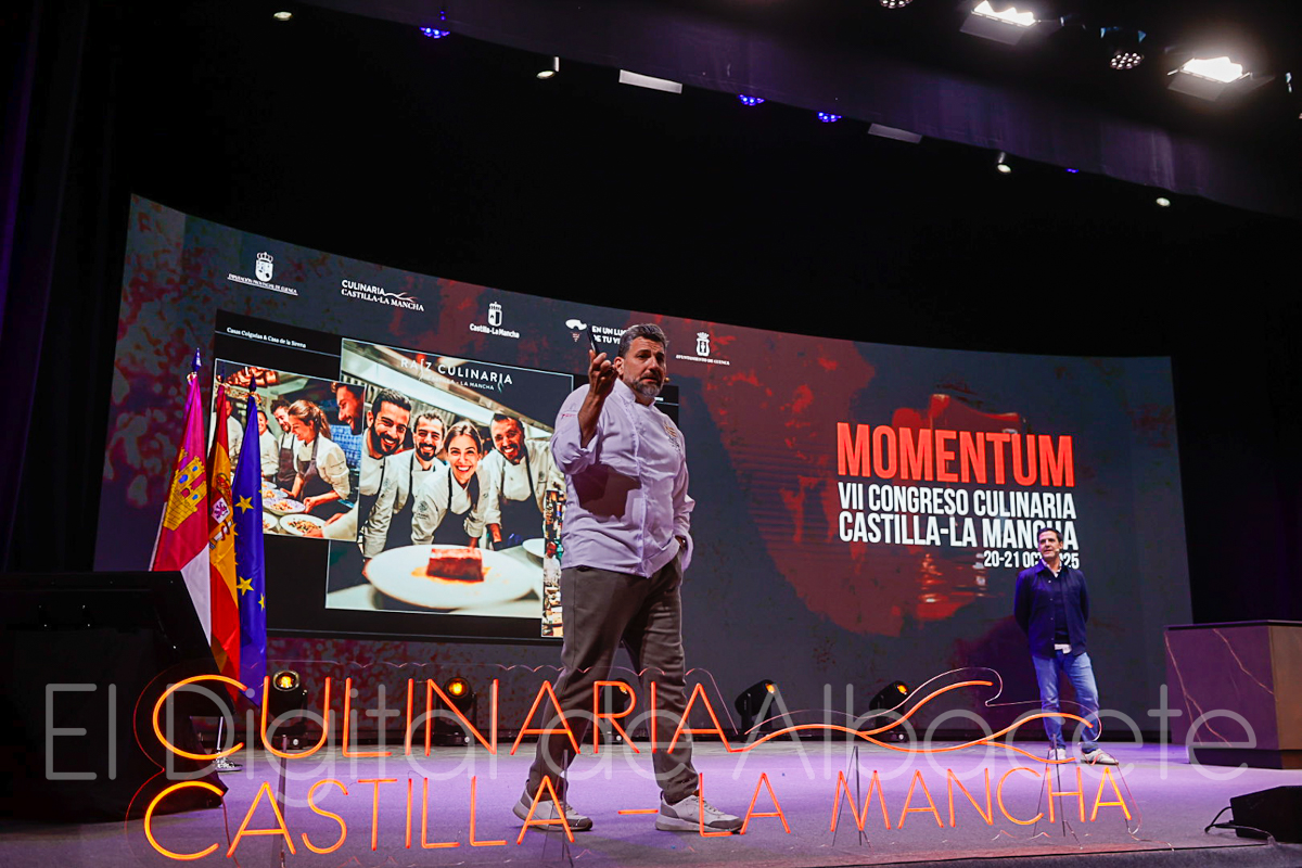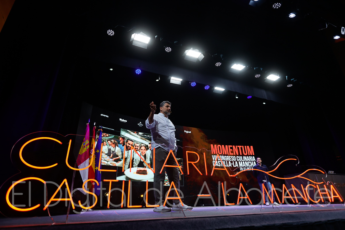 El Congreso ‘Culinaria Castilla-La Mancha’ que ha comenzado este lunes en Cuenca no solo ha congregado importantes cocineros de la región, sino también excelentes chefs de fuera del mapa castellanomanchego y que son un auténtico motor para los de la casa. Después de la entrega de premios y las presentaciones oficiales llegó el momento de dar voz a los expertos que se hacían un hueco entre los brindis y las celebraciones de reconocidos bodegueros convocados a la cita.
