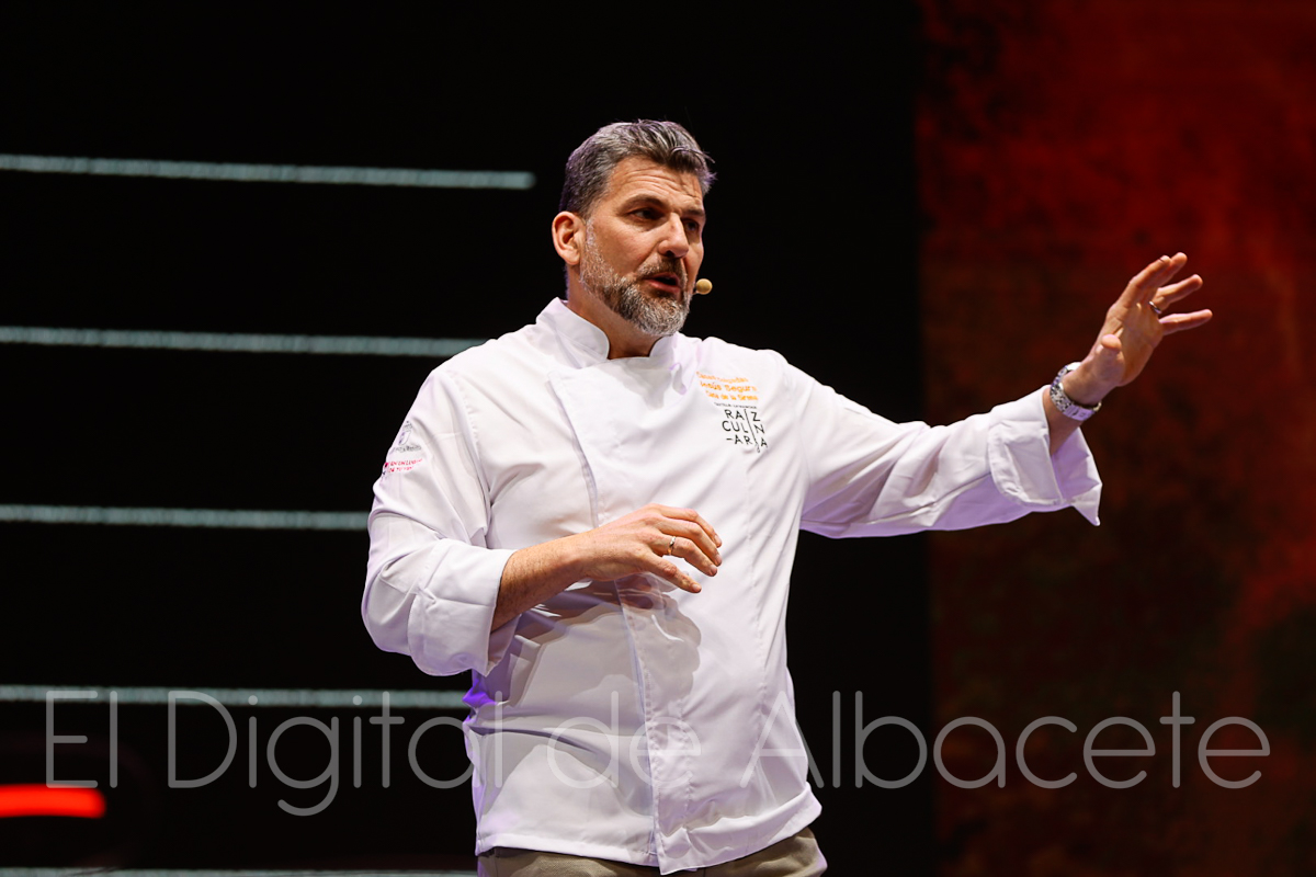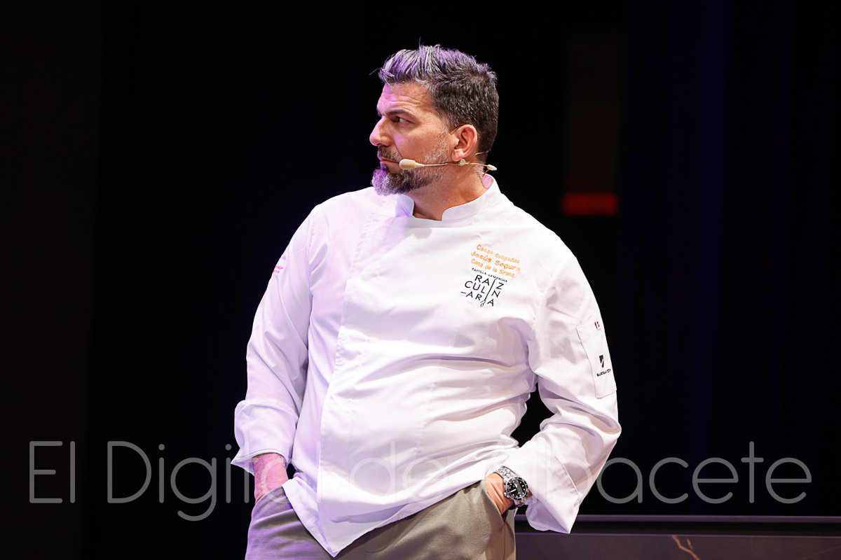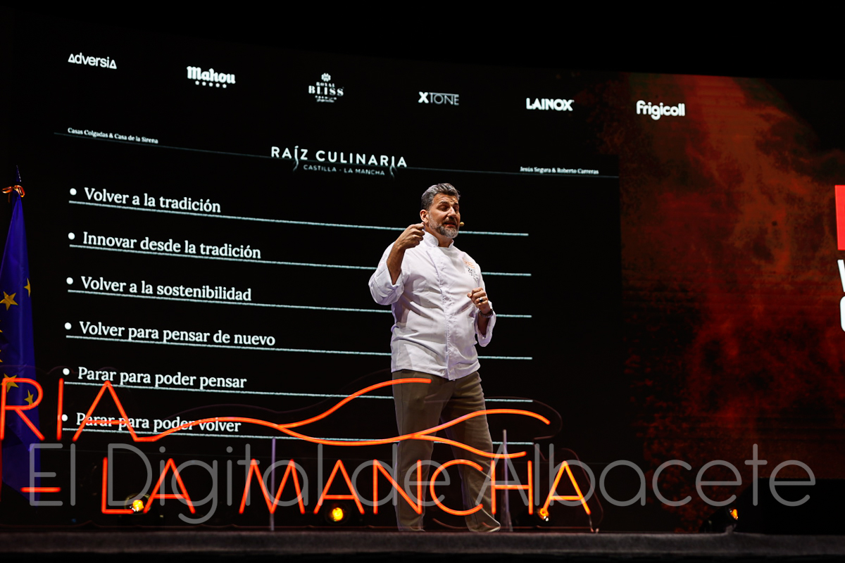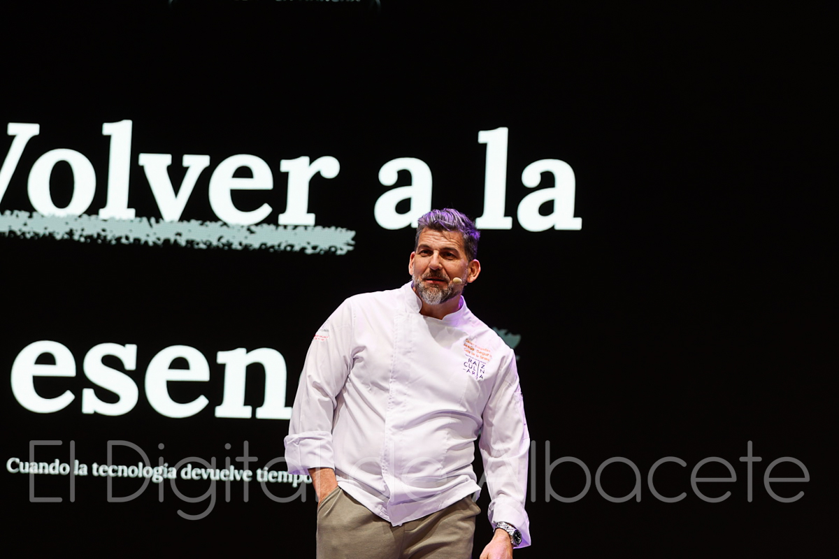 Seguramente uno de los chefs más esperados del Congreso fue Jesús Segura, el Estrella Michelín conquense que lidera un proyecto muy solvente y puntero en el Restaurante Casas Colgadas de Cuenca. El Restaurante Casa de la Sirena también está a su cargo con necesidades diferentes. Con su lema ‘Volver a la esencia’ quiso transmitir su idea de aplicar la Inteligencia Artificial a los restaurantes, o sea, cómo humanizar la gastronomía para tener más tiempo en los equipos y minimizar el coste emocional de una atención tan personalizada al público.