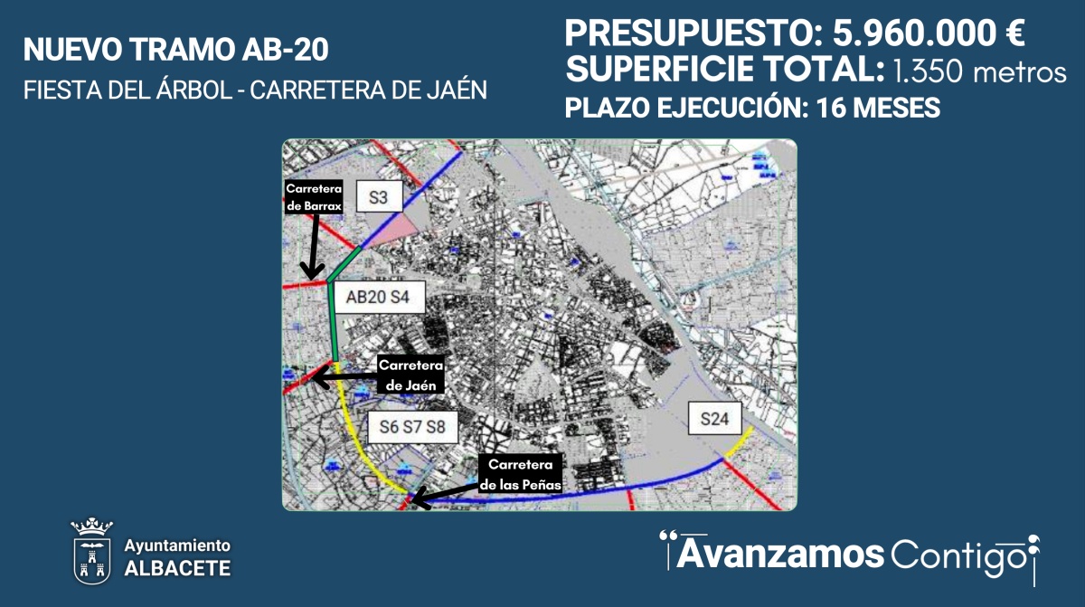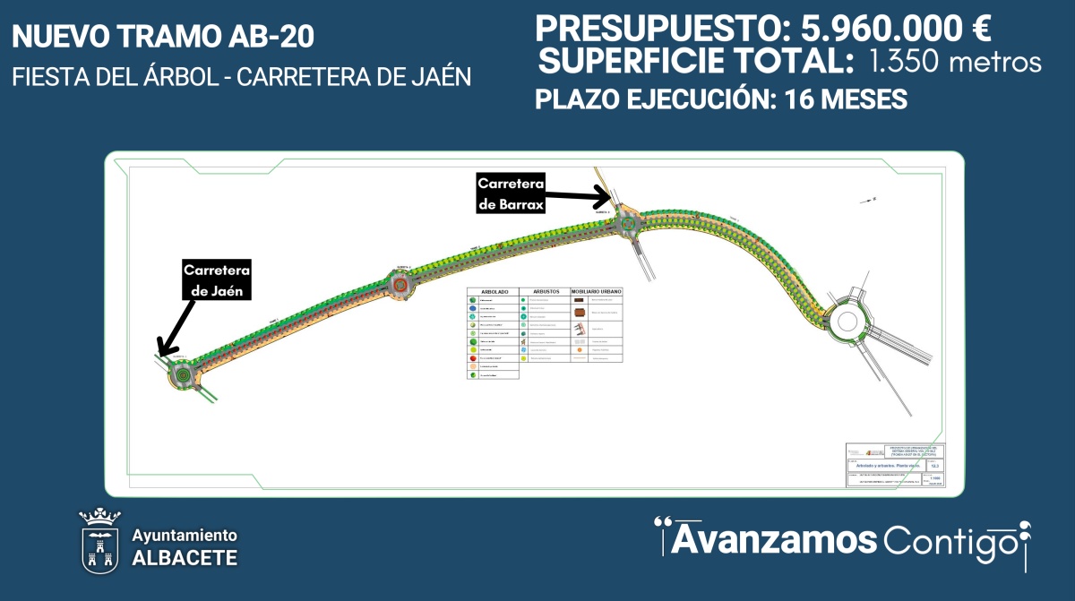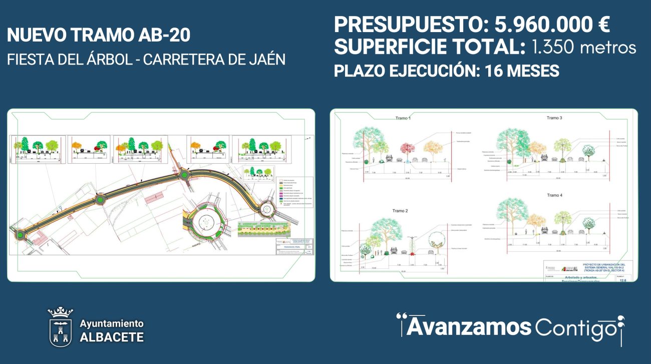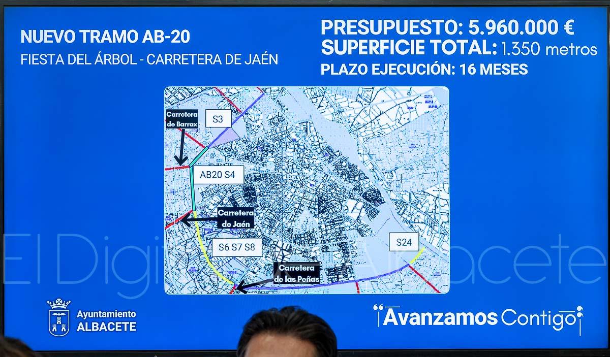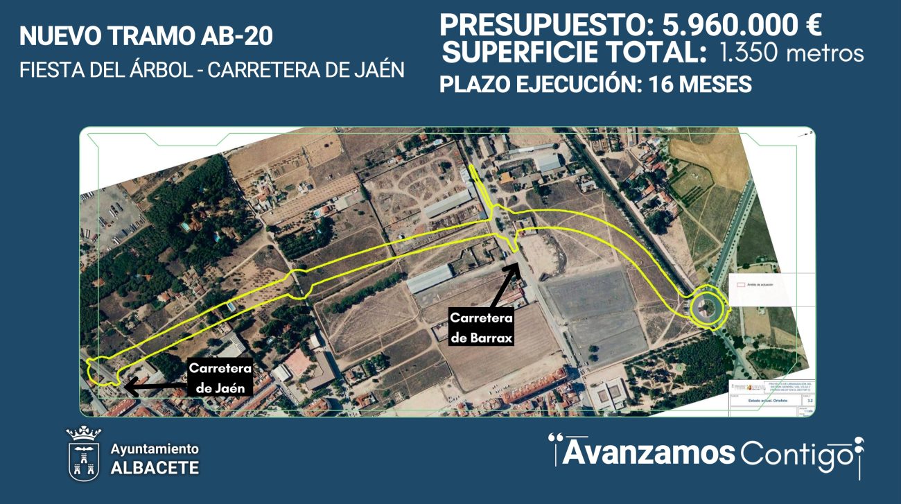 El nuevo tramo de la AB-20 tendrá una longitud de 1.350 metros, desde la glorieta de la Fiesta del Árbol —donde finaliza el Sector 3 y la calle Virgen del Pilar— hasta la carretera de Jaén, atravesando la carretera de Barrax. En esta zona confluyen tres accesos principales a la ciudad: la N-430 (Barrax), la N-322 (Jaén) y el camino de Pozo Majano, que canaliza el tráfico desde el polígono de Campollano. Según el alcalde, estas tres radiales se concentran en un punto de la circunvalación con mayor complejidad y densidad de tráfico, junto a la Feria, por lo que la actuación aliviará la circulación en el entorno.