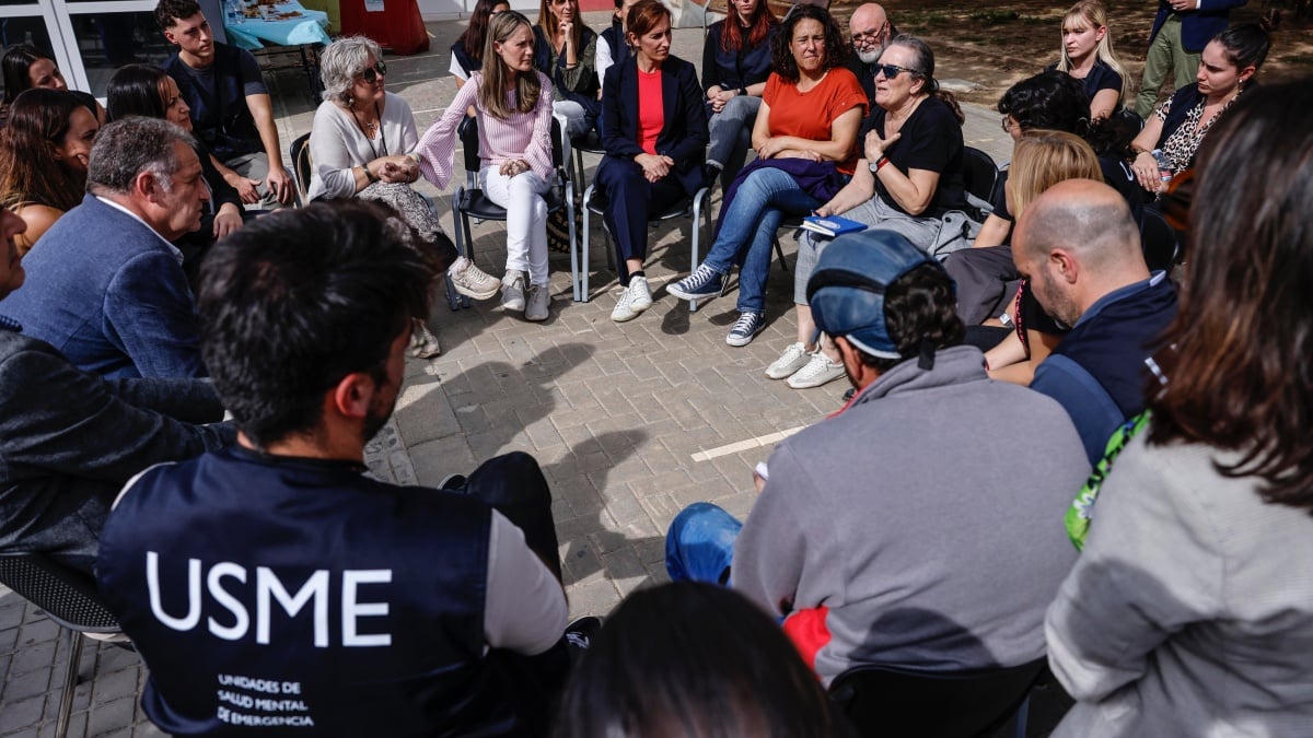 La ministra de Sanidad, Mónica García, ha visitado este lunes, en la localidad de Catarroja, a los miembros de la USME que trabajan sobre el terreno y ha participado en una de sus actividades comunitarias con afectados por la dana y Asociaciones de Víctimas.