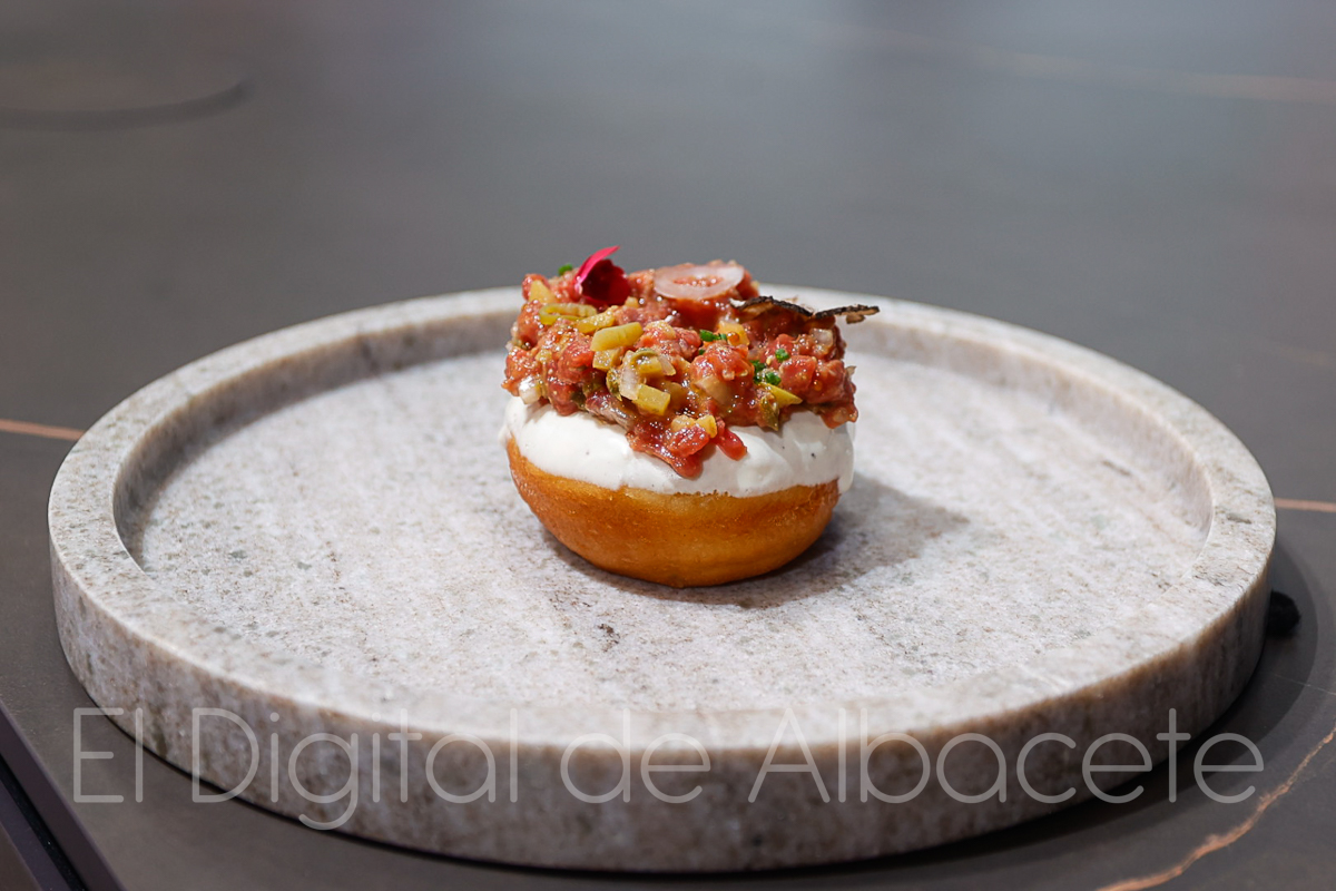 Como toque innovador, reemplazó el pepinillo típico por berenjena de Almagro con DOP y sirvió el tartar sobre un donut ligeramente dulzón con glaseado de mantequilla ahumada y trufa de Cifuentes, logrando un equilibrio entre tradición y creatividad. Completó el plato con chalota, piñones, piparras, cebollino, pétalo de flor y una lámina de trufa, manteniendo siempre la temperatura adecuada gracias a un baño maría invertido.