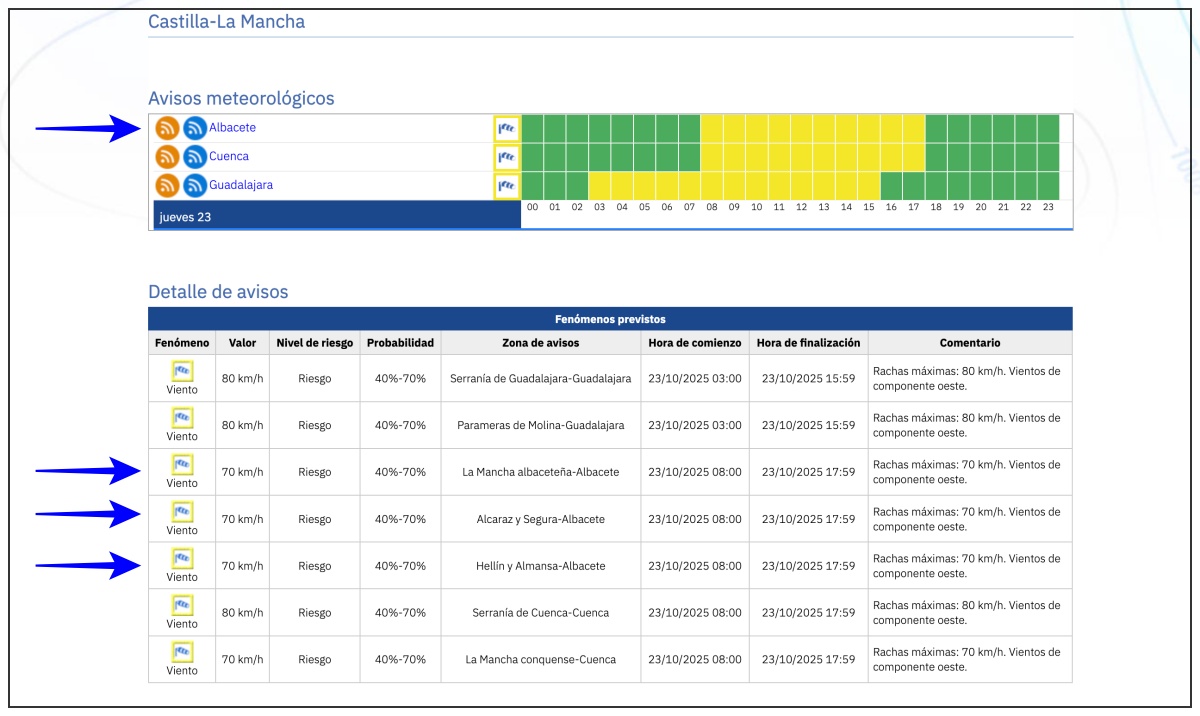 El nivel amarillo indica riesgo para actividades concretas y en zonas expuestas, sin alcanzar la gravedad de los niveles naranja o rojo. La AEMET mantiene actualizados los mapas de avisos y la predicción municipal detallada para Albacete, que conviene consultar con frecuencia ante posibles cambios de última hora.